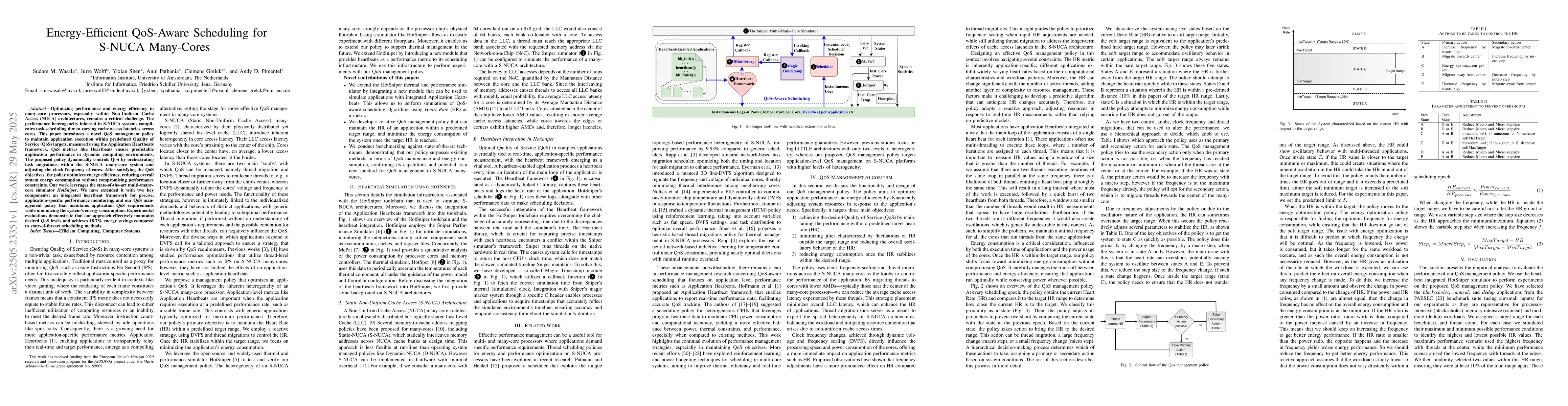 This paper proposes a QoS-aware scheduling policy for S-NUCA many-cores to optimize performance and energy efficiency, achieving 18.7% energy savings while maintaining desired quality of service levels.
