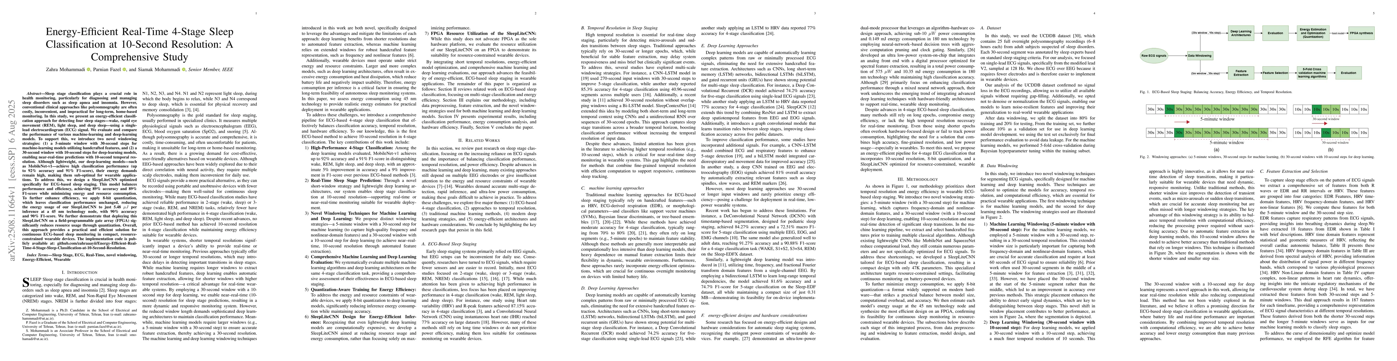 Sleep stage classification is crucial for diagnosing and managing disorders such as sleep apnea and insomnia. Conventional clinical methods like polysomnography are costly and impractical for long-term home use. We present an energy-efficient pipeline that detects four sleep stages (wake, REM, light, and deep) from a single-lead ECG. Two windowing strategies are introduced: (1) a 5-minute window with 30-second steps for machine-learning models that use handcrafted features, and (2) a 30-second window with 10-second steps for deep-learning models, enabling near-real-time 10-second resolution. Lightweight networks such as MobileNet-v1 reach 92 percent accuracy and 91 percent F1-score but still draw significant energy. We therefore design SleepLiteCNN, a custom model that achieves 89 percent accuracy and 89 percent F1-score while lowering energy use to 5.48 microjoules per inference at 45 nm. Applying eight-bit quantization preserves accuracy and further reduces power, and FPGA deployment confirms low resource usage. The proposed system offers a practical solution for continuous, wearable ECG-based sleep monitoring.