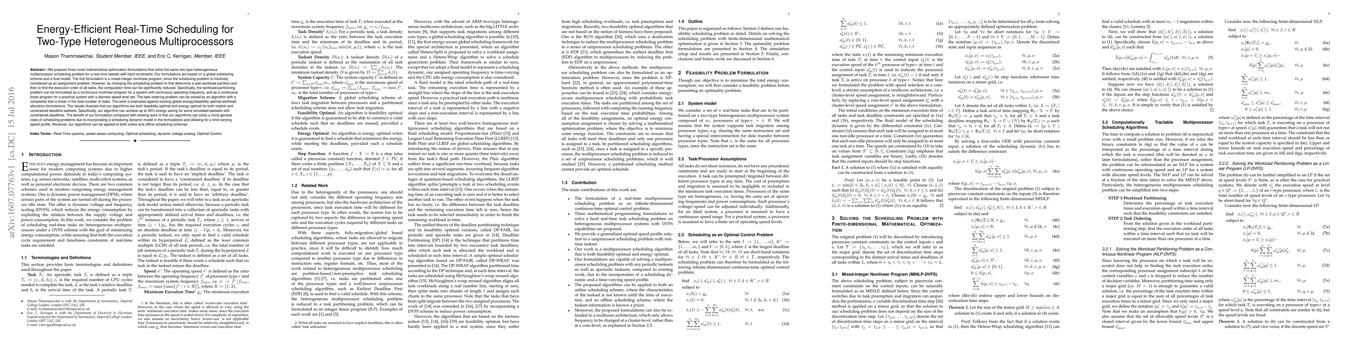 We propose three novel mathematical optimization formulations that solve the same two-type heterogeneous multiprocessor scheduling problem for a real-time taskset with hard constraints. Our formulations are based on a global scheduling scheme and a fluid model. The first formulation is a mixed-integer nonlinear program, since the scheduling problem is intuitively considered as an assignment problem. However, by changing the scheduling problem to first determine a task workload partition and then to find the execution order of all tasks, the computation time can be significantly reduced. Specifically, the workload partitioning problem can be formulated as a continuous nonlinear program for a system with continuous operating frequency, and as a continuous linear program for a practical system with a discrete speed level set. The task ordering problem can be solved by an algorithm with a complexity that is linear in the total number of tasks. The work is evaluated against existing global energy/feasibility optimal workload allocation formulations. The results illustrate that our algorithms are both feasibility optimal and energy optimal for both implicit and constrained deadline tasksets. Specifically, our algorithm can achieve up to 40% energy saving for some simulated tasksets with constrained deadlines. The benefit of our formulation compared with existing work is that our algorithms can solve a more general class of scheduling problems due to incorporating a scheduling dynamic model in the formulations and allowing for a time-varying speed profile. Moreover, our algorithms can be applied to both online and offline scheduling schemes.