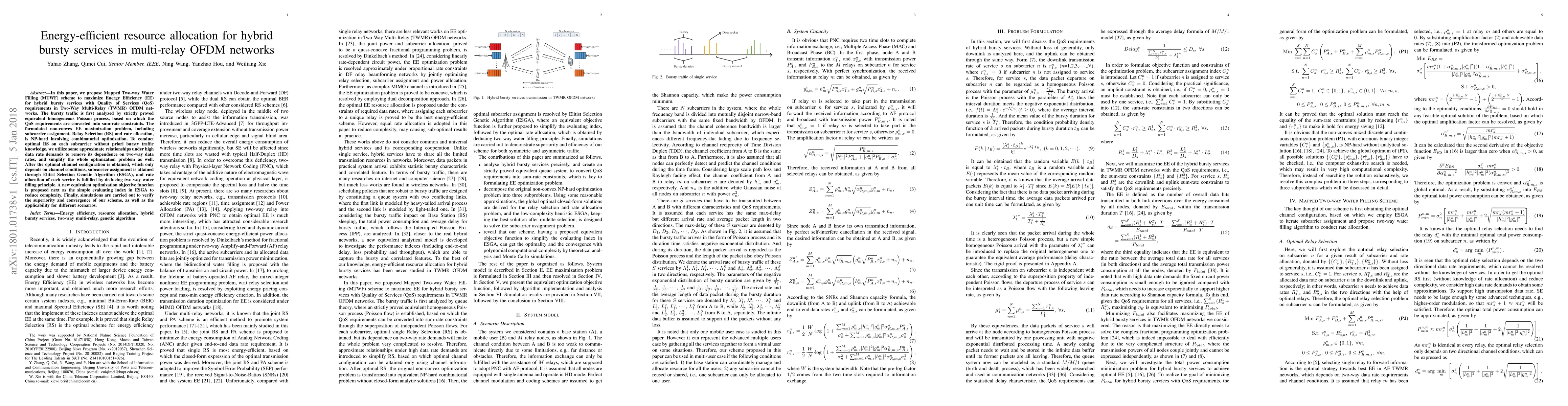 This paper proposes a Mapped Two-way Water Filling (MTWF) scheme to maximize Energy Efficiency (EE) for hybrid bursty services in Two-Way Multi-Relay (TWMR) OFDM networks, employing an Elitist Selection Genetic Algorithm (ESGA) for subcarrier assignment and a two-way water filling principle for rate allocation. Simulations demonstrate the scheme's effectiveness and convergence.