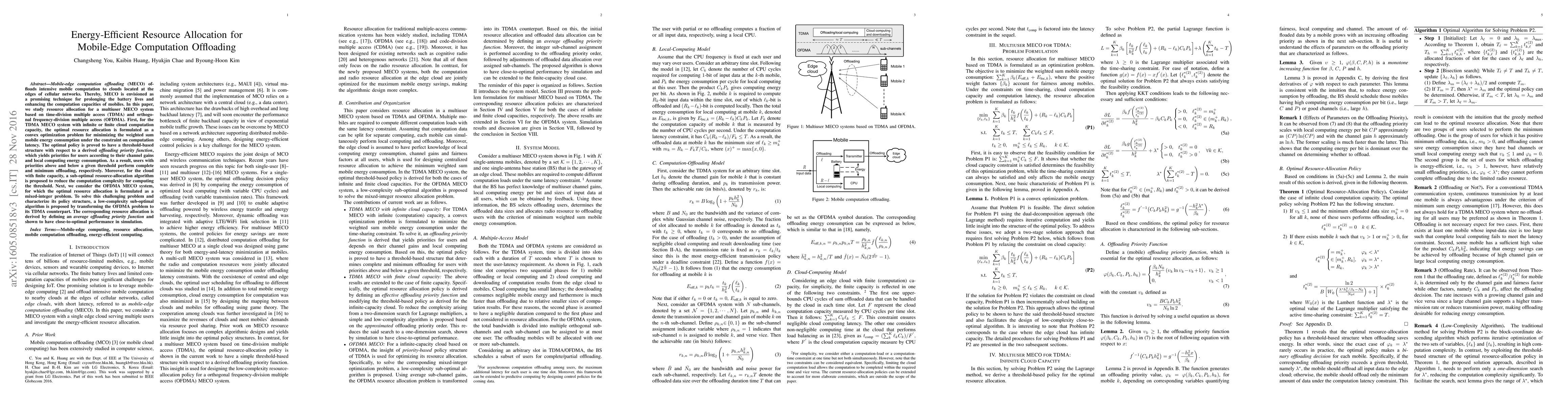 This paper investigates energy-efficient resource allocation strategies for mobile-edge computation offloading (MECO) systems using TDMA and OFDMA. It formulates optimal and sub-optimal resource allocation algorithms to minimize mobile energy consumption while managing computation latency, with a focus on both infinite and finite computation capacities.