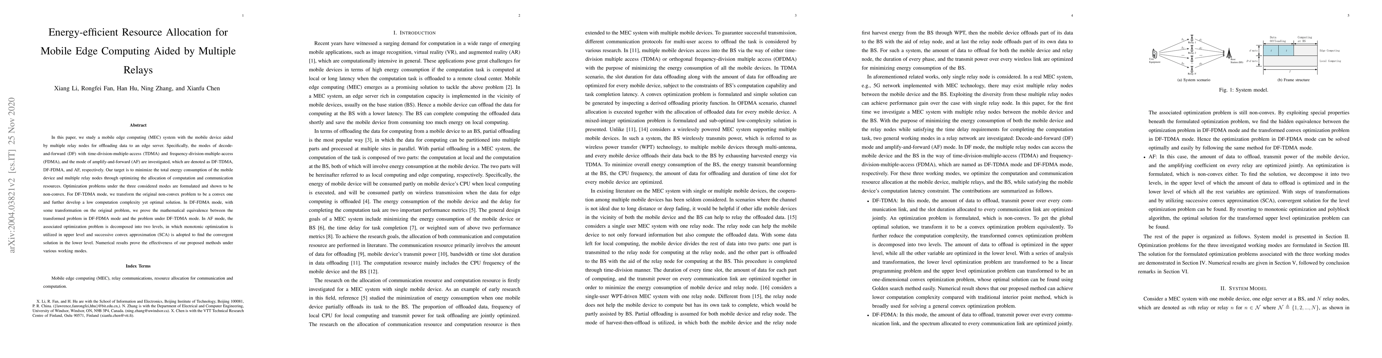 This research paper optimizes energy-efficient resource allocation for mobile edge computing systems using multiple relays, proposing methods to minimize total energy consumption in different modes of decode-and-forward and amplify-and-forward protocols.
