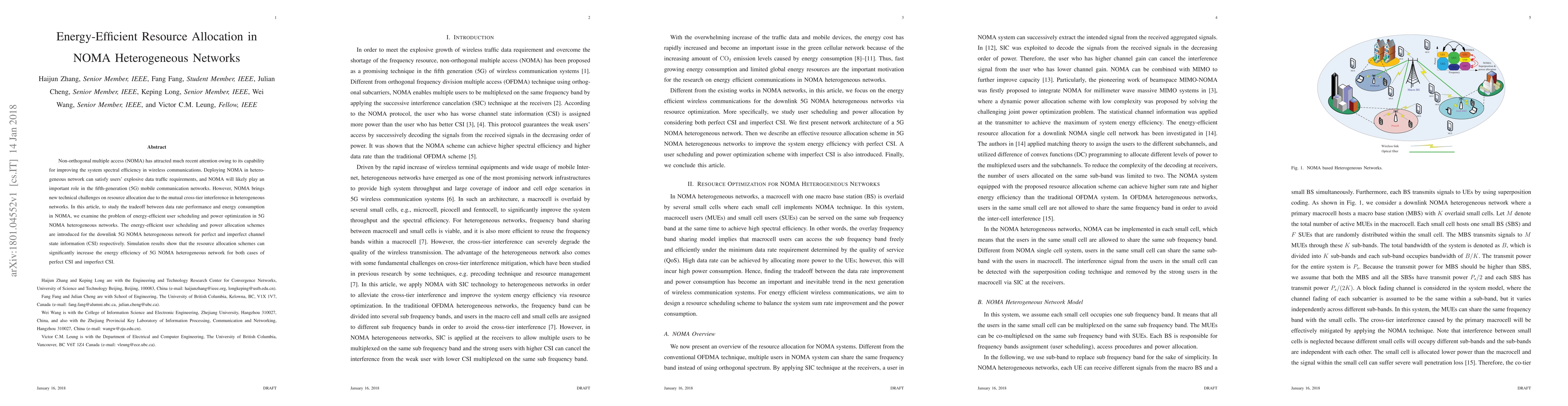 This paper investigates energy-efficient resource allocation strategies for NOMA in 5G heterogeneous networks, addressing the challenge of mutual cross-tier interference. It proposes user scheduling and power optimization schemes that significantly enhance energy efficiency under both perfect and imperfect channel state information conditions.