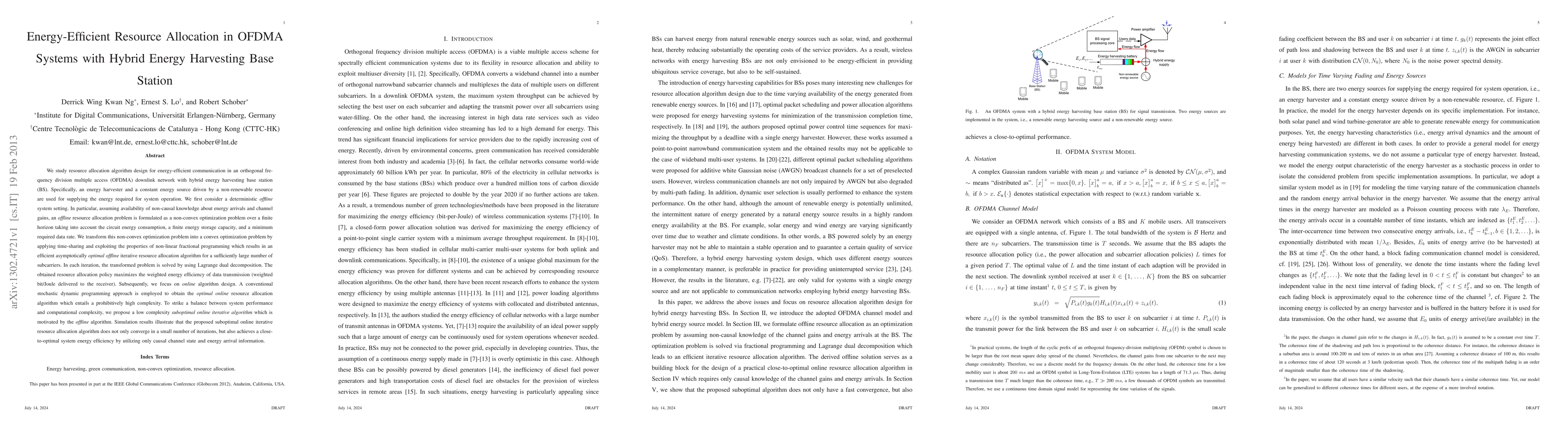 This paper proposes an energy-efficient resource allocation algorithm for OFDMA systems with hybrid energy harvesting base stations, transforming a non-convex offline optimization problem into a convex one for efficient iterative solutions. It also introduces a low complexity suboptimal online algorithm for practical implementation.