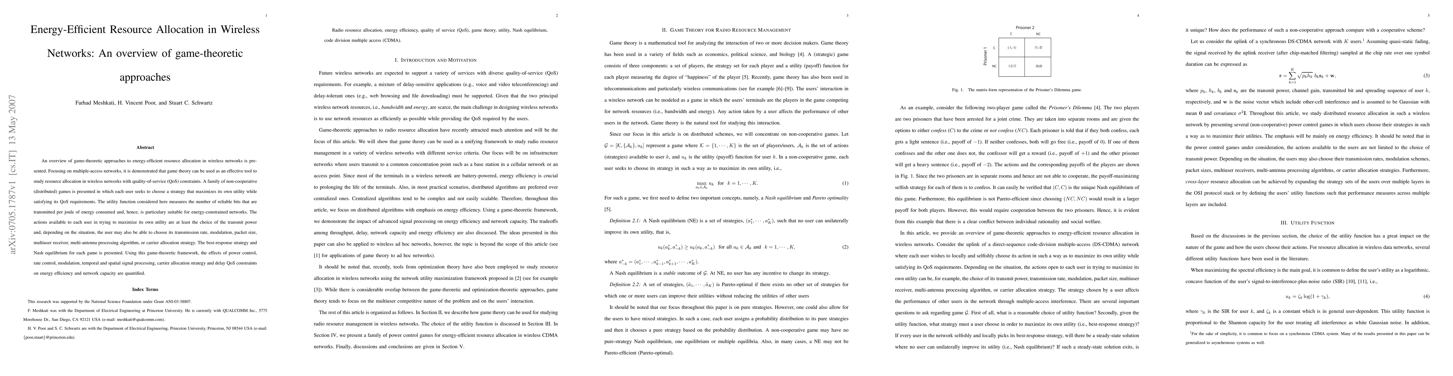 This paper provides an overview of game-theoretic methods for energy-efficient resource allocation in wireless networks, focusing on non-cooperative games where users maximize their utility based on reliable bits per joule of energy. It analyzes the impact of various strategies on energy efficiency and network capacity under QoS constraints.