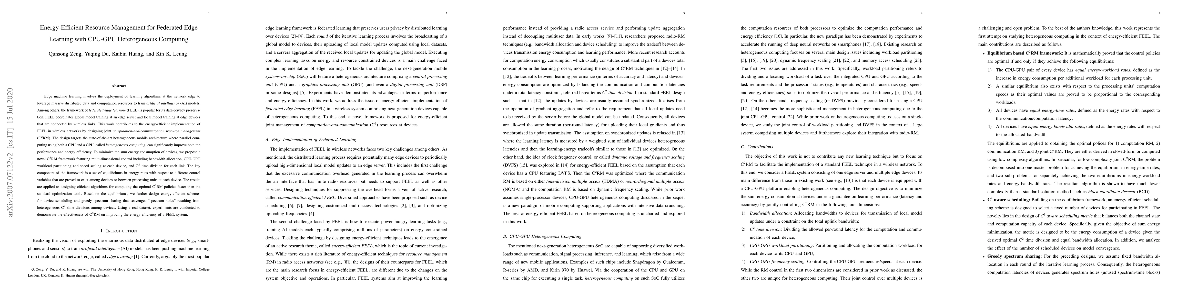 Edge machine learning involves the deployment of learning algorithms at the network edge to leverage massive distributed data and computation resources to train artificial intelligence (AI) models. Among others, the framework of federated edge learning (FEEL) is popular for its data-privacy preservation. FEEL coordinates global model training at an edge server and local model training at edge devices that are connected by wireless links. This work contributes to the energy-efficient implementation of FEEL in wireless networks by designing joint computation-and-communication resource management ($\text{C}^2$RM). The design targets the state-of-the-art heterogeneous mobile architecture where parallel computing using both a CPU and a GPU, called heterogeneous computing, can significantly improve both the performance and energy efficiency. To minimize the sum energy consumption of devices, we propose a novel $\text{C}^2$RM framework featuring multi-dimensional control including bandwidth allocation, CPU-GPU workload partitioning and speed scaling at each device, and $\text{C}^2$ time division for each link. The key component of the framework is a set of equilibriums in energy rates with respect to different control variables that are proved to exist among devices or between processing units at each device. The results are applied to designing efficient algorithms for computing the optimal $\text{C}^2$RM policies faster than the standard optimization tools. Based on the equilibriums, we further design energy-efficient schemes for device scheduling and greedy spectrum sharing that scavenges "spectrum holes" resulting from heterogeneous $\text{C}^2$ time divisions among devices. Using a real dataset, experiments are conducted to demonstrate the effectiveness of $\text{C}^2$RM on improving the energy efficiency of a FEEL system.
