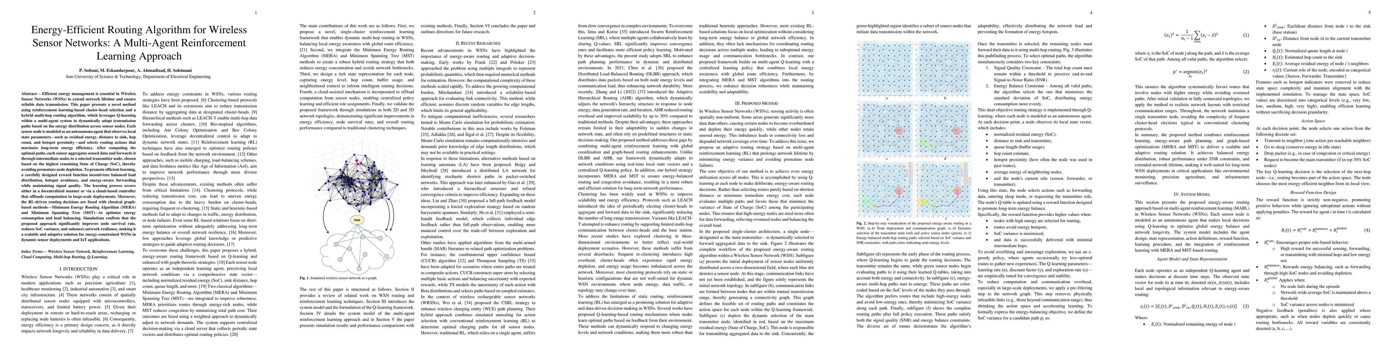 The paper presents a novel hybrid routing algorithm that leverages MARL, MERA, and MST to optimize energy efficiency and load balancing in WSNs.