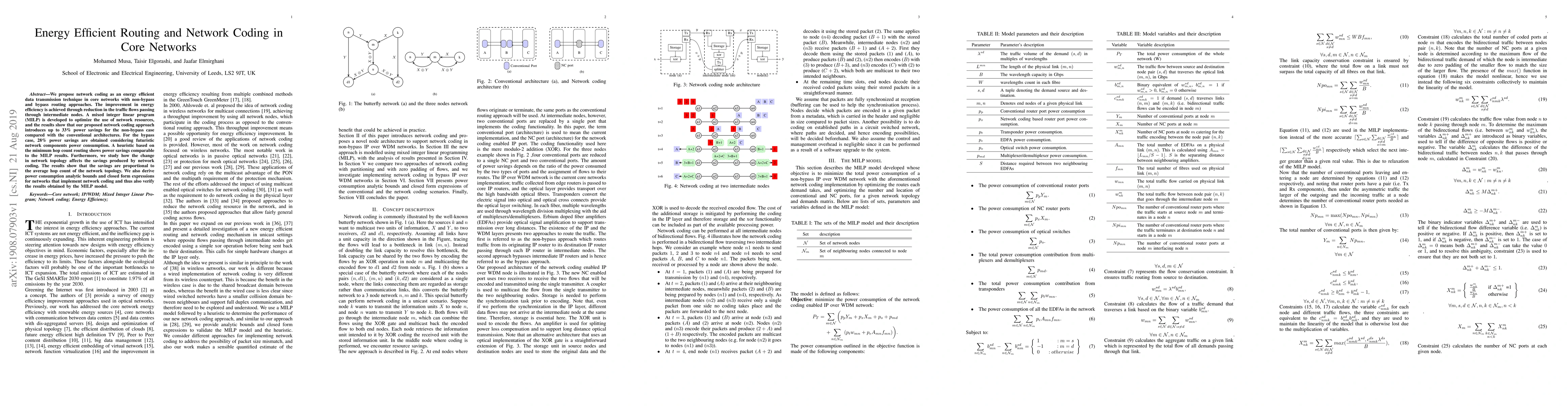 We propose network coding as an energy efficient data transmission technique in core networks with non-bypass and bypass routing approaches. The improvement in energy efficiency is achieved through reduction in the traffic flows passing through intermediate nodes. A mixed integer linear program (MILP) is developed to optimize the use of network resources, and the results show that our proposed network coding approach introduces up to 33% power savings for the non-bypass case compared with the conventional architectures. For the bypass case, 28% power savings are obtained considering futuristic network components power consumption. A heuristic based on the minimum hop count routing shows power savings comparable to the MILP results. Furthermore, we study how the change in network topology affects the savings produced by network coding. The results show that the savings are proportional to the average hop count of the network topology. We also derive power consumption analytic bounds and closed form expressions for networks that implement network coding and thus also verify the results obtained by the MILP model.