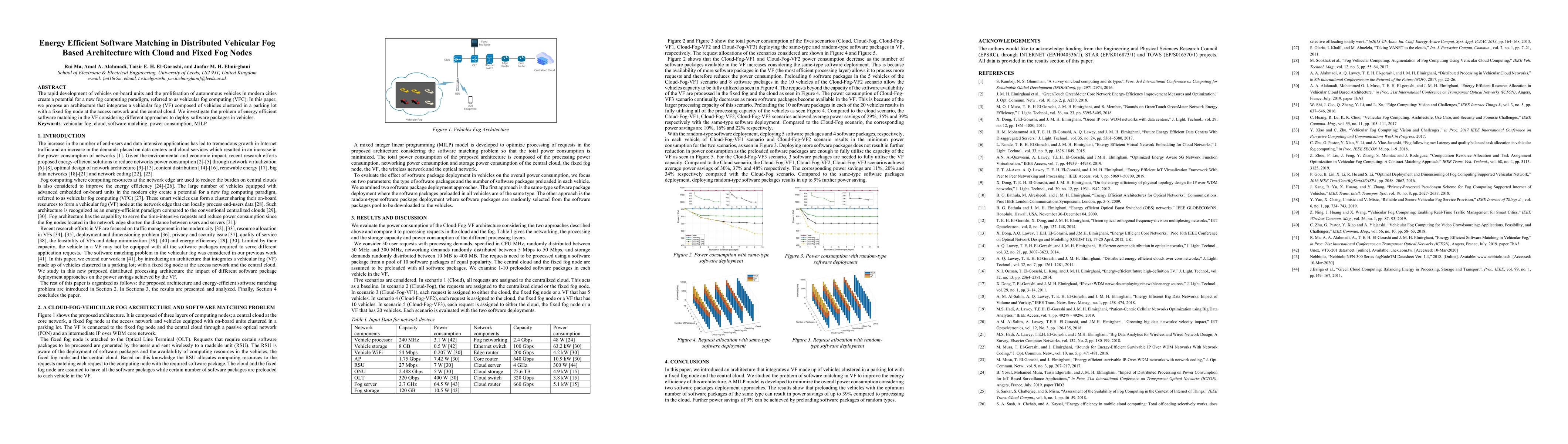 This paper proposes an energy-efficient software matching system for a vehicular fog-based architecture that combines cloud and fixed fog nodes, aiming to reduce energy consumption in autonomous vehicles.