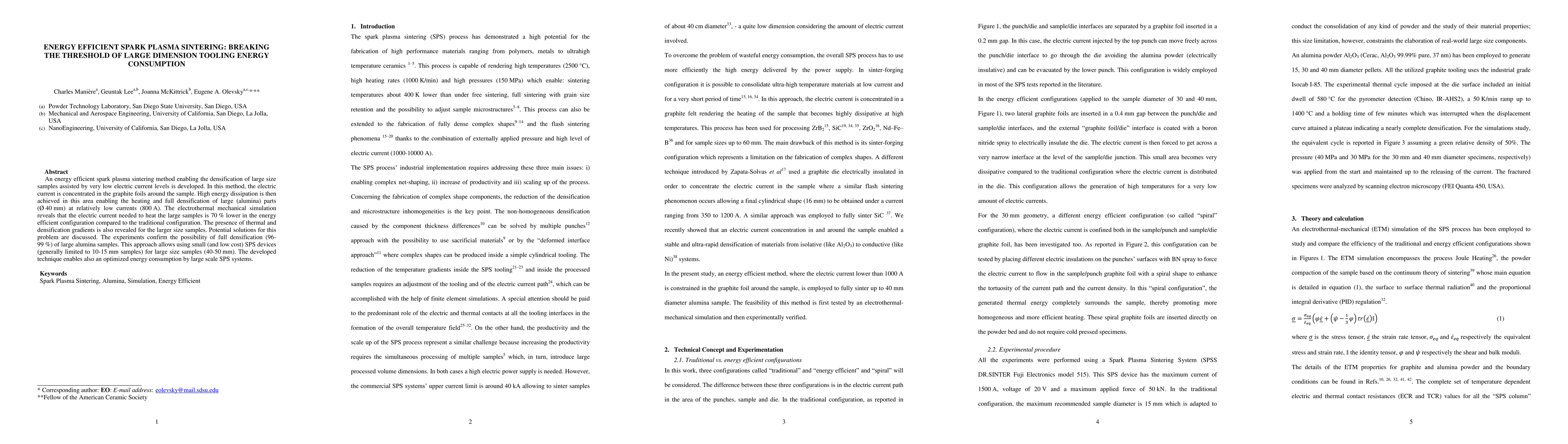 This paper develops an energy-efficient spark plasma sintering method that significantly reduces energy consumption for densifying large samples using low electric currents. The technique concentrates current in graphite foils, achieving full densification of 40 mm alumina parts at 800 A, 70% less than traditional methods.