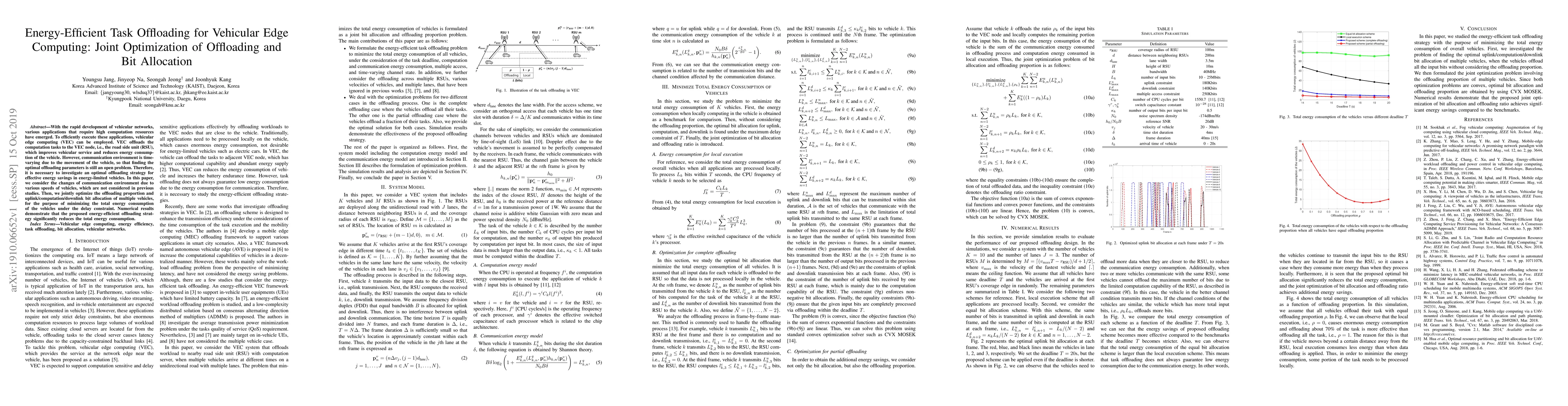 This paper proposes an optimal joint optimization strategy for task offloading and bit allocation in vehicular edge computing to minimize energy consumption while considering the time-varying communication environment due to vehicle movement. The results show significant energy savings compared to previous methods.