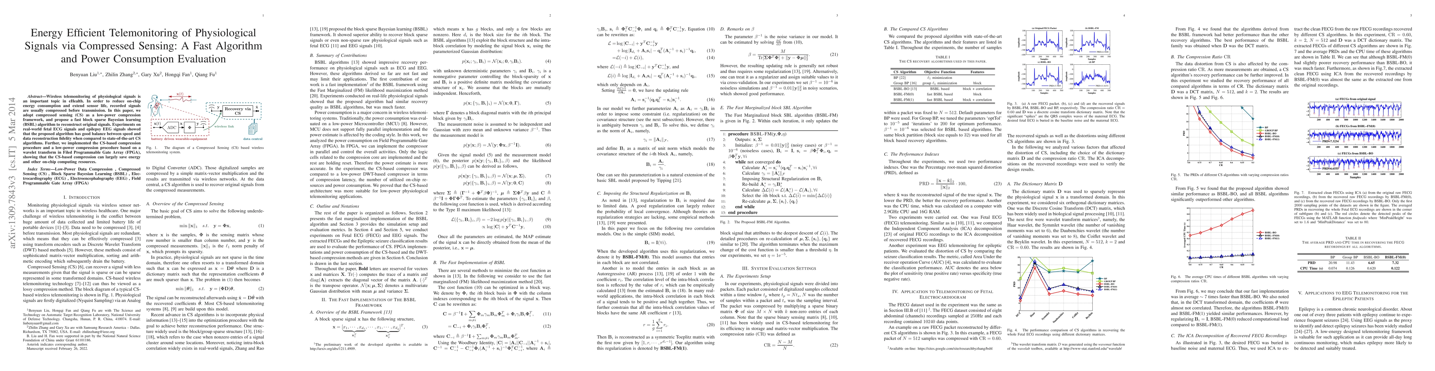 This paper proposes a fast block sparse Bayesian learning (BSBL) algorithm for energy-efficient compressed sensing in wireless telemonitoring of physiological signals. Experimental results demonstrate the algorithm's balance between speed and reconstruction fidelity, and FPGA implementation shows significant energy savings compared to wavelet-based compression.
