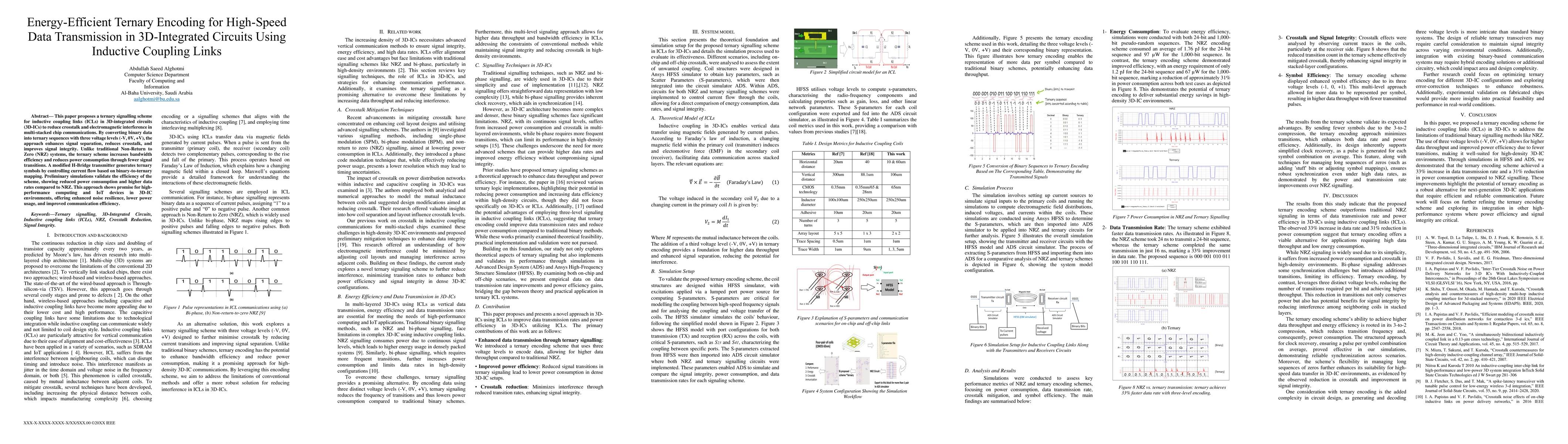 The paper proposes a ternary signalling scheme for inductive coupling links (ICLs) in 3D-integrated circuits (3D-ICs), converting binary data into ternary sequences using a modified H-Bridge transmitter with binary-to-ternary mapping.
