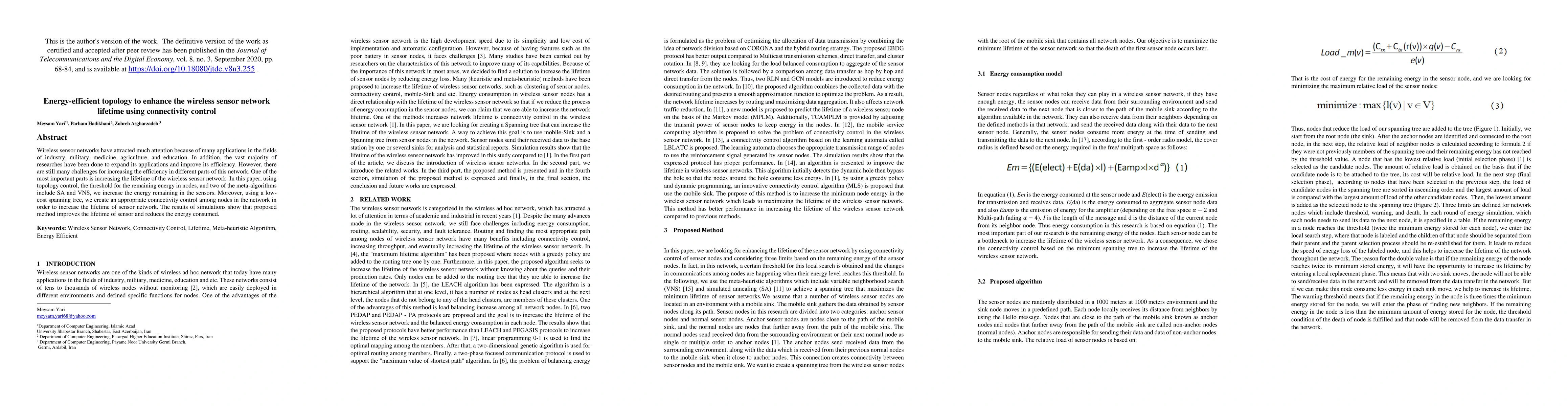 This paper proposes an energy-efficient topology control method to enhance the lifetime of wireless sensor networks by reducing power consumption through connectivity control, utilizing meta-algorithms like SA and VNS, and implementing a low-cost spanning tree. Simulation results demonstrate improved sensor network lifetime and reduced energy consumption.