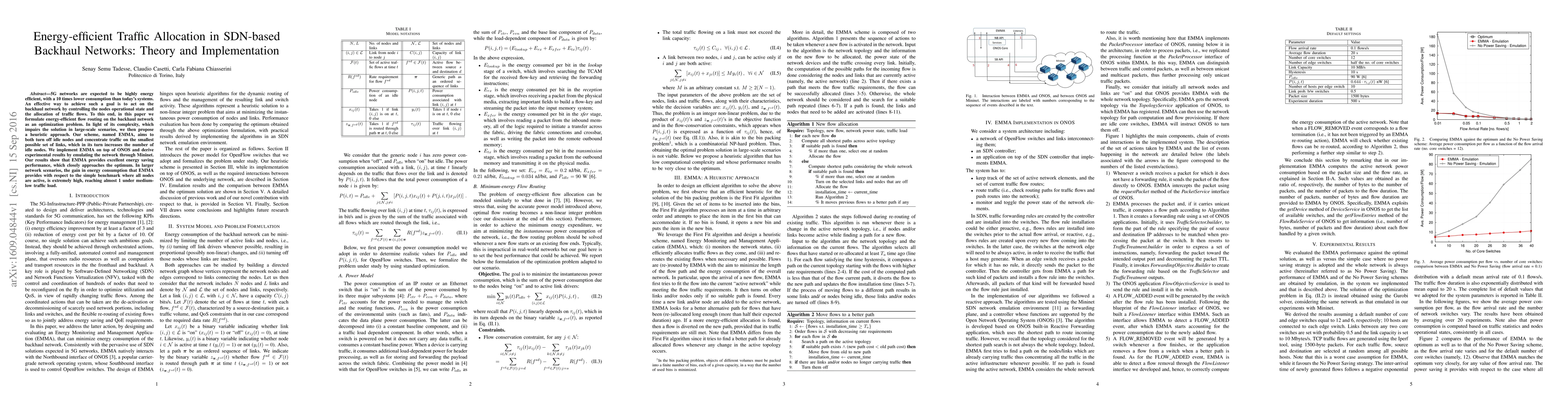 5G networks are expected to be highly energy efficient, with a 10 times lower consumption than today's systems. An effective way to achieve such a goal is to act on the backhaul network by controlling the nodes operational state and the allocation of traffic flows. To this end, in this paper we formulate energy-efficient flow routing on the backhaul network as an optimization problem. In light of its complexity, which impairs the solution in large-scale scenarios, we then propose a heuristic approach. Our scheme, named EMMA, aims to both turn off idle nodes and concentrate traffic on the smallest possible set of links, which in its turn increases the number of idle nodes. We implement EMMA on top of ONOS and derive experimental results by emulating the network through Mininet. Our results show that EMMA provides excellent energy saving performance, which closely approaches the optimum. In larger network scenarios, the gain in energy consumption that EMMA provides with respect to the simple benchmark where all nodes are active, is extremely high, reaching almost 1 under medium-low traffic load.
