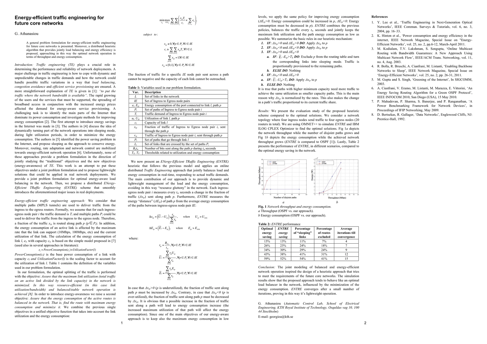This paper presents a problem formulation for energy-efficient traffic engineering in future core networks and proposes a distributed heuristic algorithm that optimizes both load balancing and energy efficiency, aiming for optimal network throughput and minimal energy consumption.