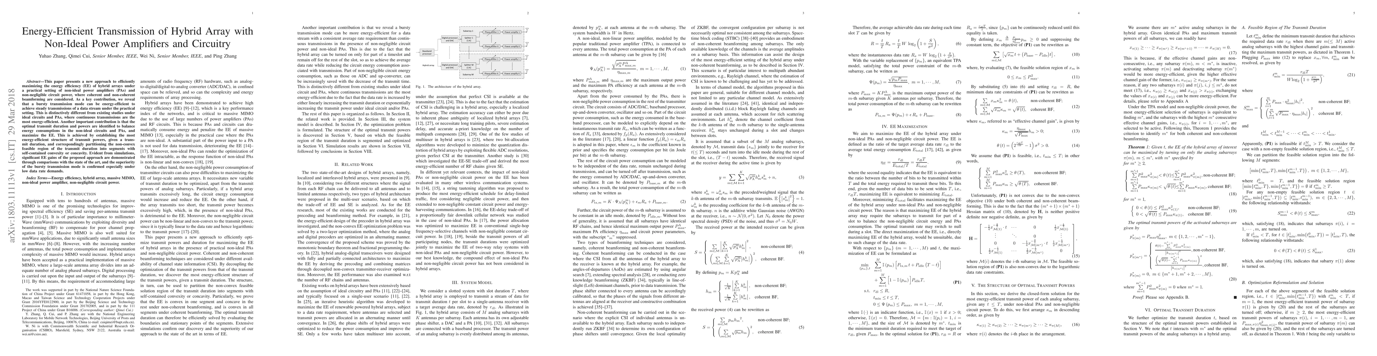 This paper proposes a new method to maximize energy efficiency in hybrid arrays with non-ideal power amplifiers and circuit power, revealing that bursty transmission modes are more energy-efficient than continuous transmissions. The study identifies optimal transmission durations and power levels to balance energy consumption and maximize efficiency, demonstrating significant gains through simulations.