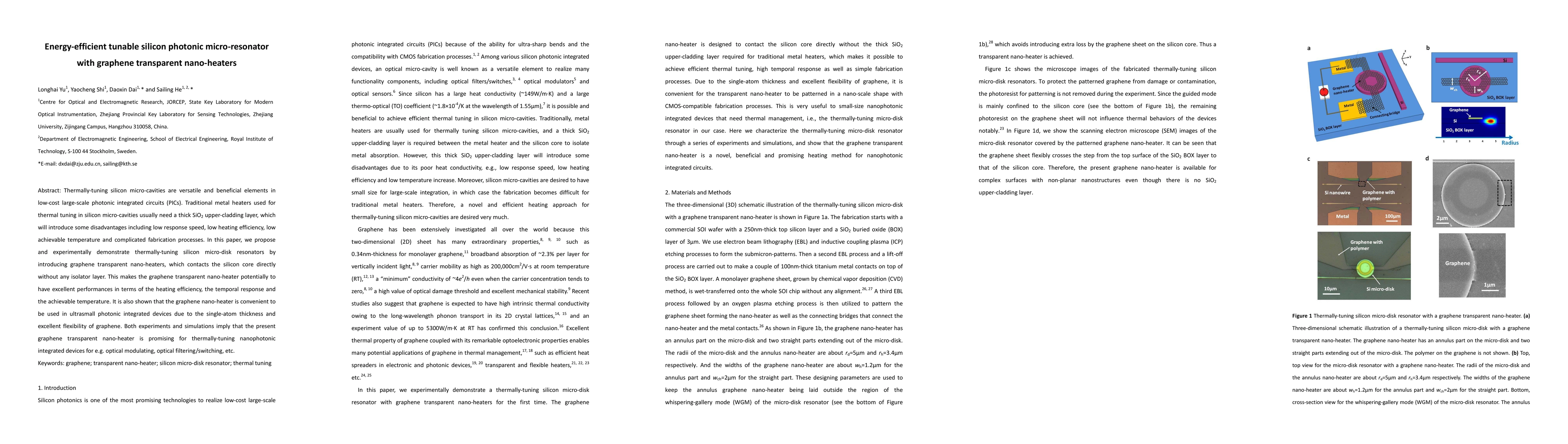 This paper proposes and demonstrates energy-efficient thermally-tunable silicon micro-resonators using graphene transparent nano-heaters, which offer superior heating efficiency, faster response times, and higher achievable temperatures compared to traditional metal heaters. The graphene nano-heaters' flexibility and ultrasmall size make them ideal for integration in photonic devices.