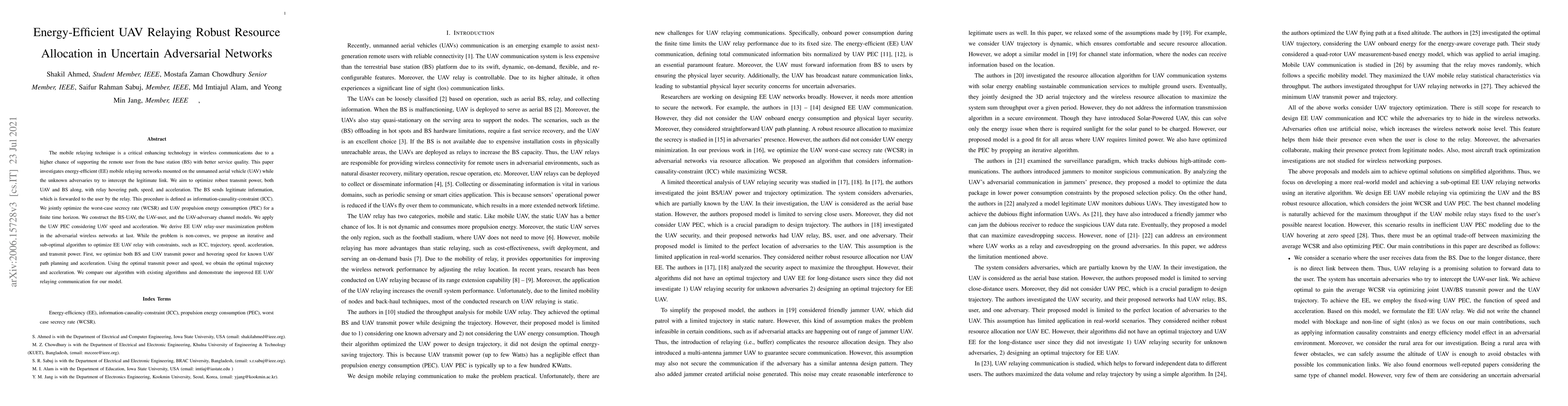 The mobile relaying technique is a critical enhancing technology in wireless communications due to a higher chance of supporting the remote user from the base station (BS) with better quality of service. This paper investigates energy-efficient (EE) mobile relaying networks, mounted on an unmanned aerial vehicle (UAV), while the unknown adversaries try to intercept the legitimate link. We aim to optimize robust transmit power both UAV and BS along, relay hovering path, speed, and acceleration. The BS sends legitimate information, which is forwarded to the user by the relay. This procedure is defined as information-causality-constraint (ICC). We jointly optimize the worst case secrecy rate (WCSR) and UAV propulsion energy consumption (PEC) for a finite time horizon. We construct the BS-UAV, the UAV-user, and the UAV-adversary channel models. We apply the UAV PEC considering UAV speed and acceleration. At last, we derive EE UAV relay-user maximization problem in the adversarial wireless networks. While the problem is non-convex, we propose an iterative and sub-optimal algorithm to optimize EE UAV relay with constraints, such as ICC, trajectory, speed, acceleration, and transmit power. First, we optimize both BS and UAV transmit power, and hovering speed for known UAV path planning and acceleration. Using the optimal transmit power and speed, we obtain the optimal trajectory and acceleration. We compare our algorithm with existing algorithms and demonstrate the improved EE UAV relaying communication for our model.
