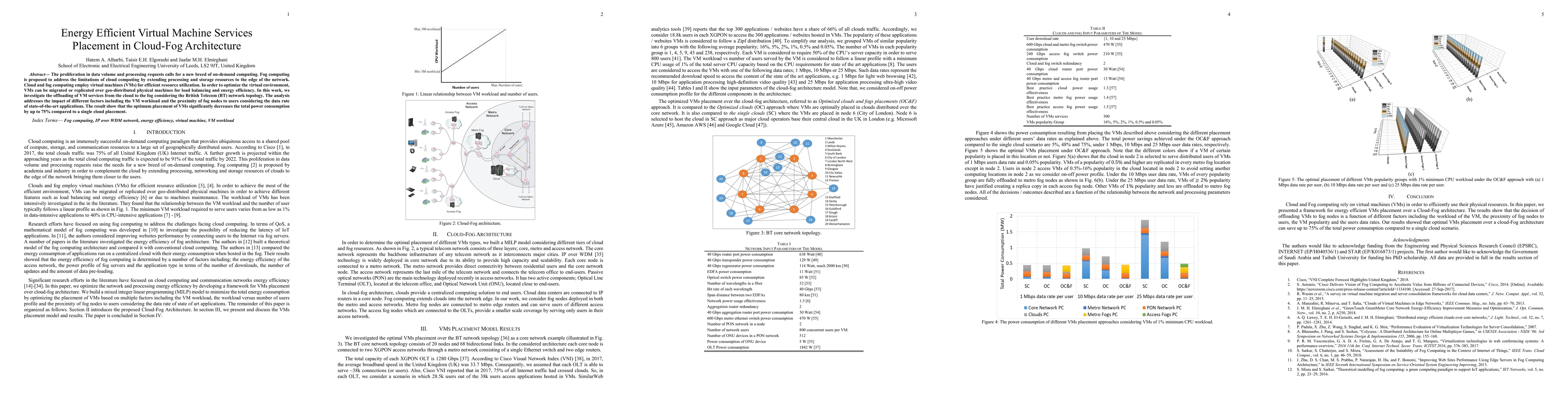 This research examines the energy-efficient placement of virtual machine (VM) services in a cloud-fog architecture, showing that optimal VM placement in fog nodes near users can reduce total power consumption by up to 75% compared to cloud-only placements. The study considers BT network topology and various workload factors.