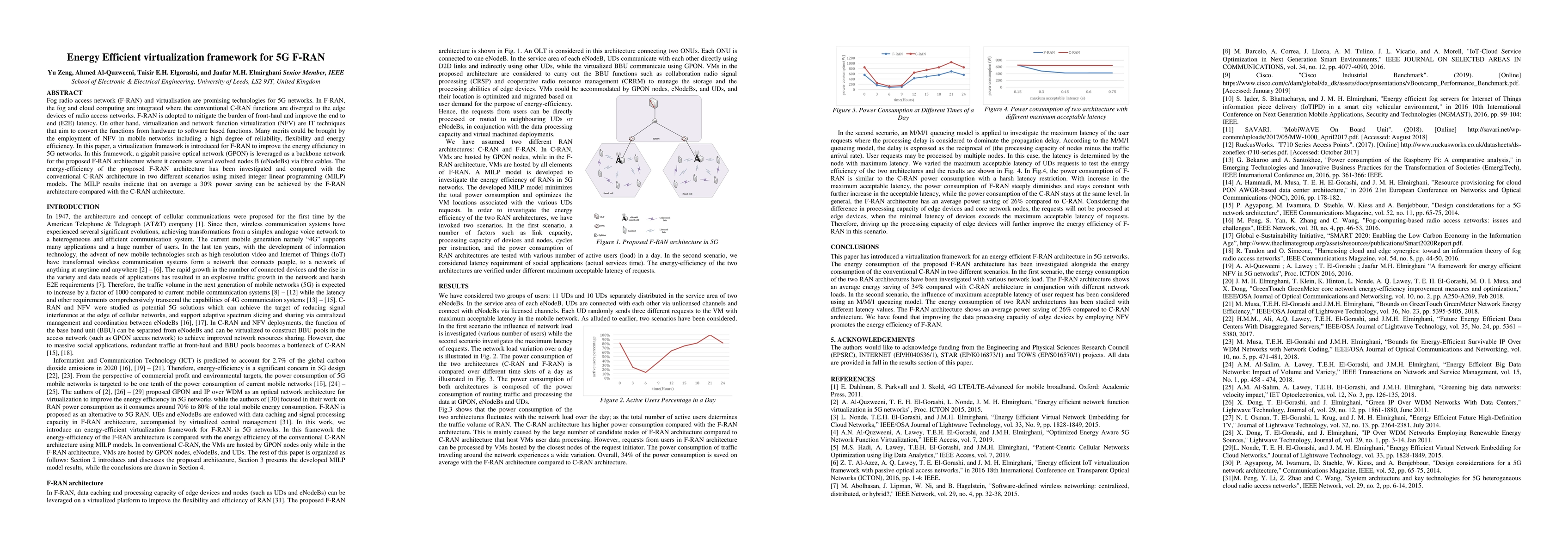 This paper introduces an energy-efficient virtualization framework for 5G Fog Radio Access Network (F-RAN) using Network Function Virtualization (NFV) to reduce power consumption. The proposed F-RAN architecture leverages a GPON backbone, achieving an average 30% power saving compared to conventional Cloud-RAN (C-RAN) as demonstrated by mixed integer linear programming (MILP) models.
