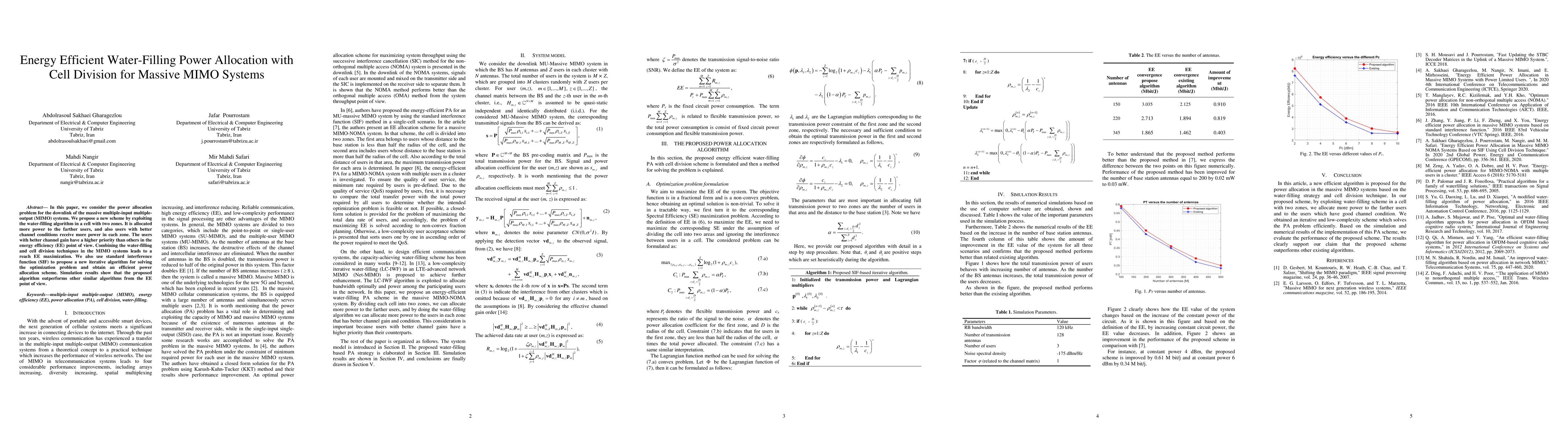 This paper proposes a power allocation scheme for massive MIMO systems using water-filling and cell division techniques to maximize energy efficiency. An iterative algorithm based on the standard interference function is developed to solve the optimization problem, demonstrating superior performance in simulations.