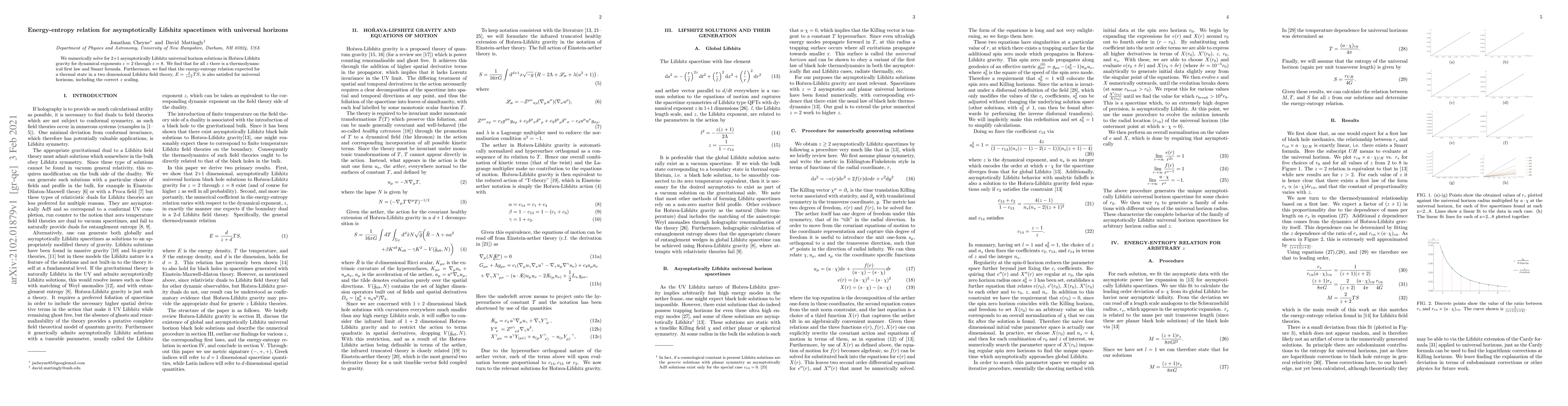 This paper numerically investigates asymptotically Lifshitz spacetimes in Horava-Lifshitz gravity, revealing a thermodynamical first law and Smarr formula for $z=2$ to $z=8$. It also confirms the energy-entropy relation $E=\frac{2}{z+2}TS$ for universal horizons, consistent with two-dimensional Lifshitz field theory.