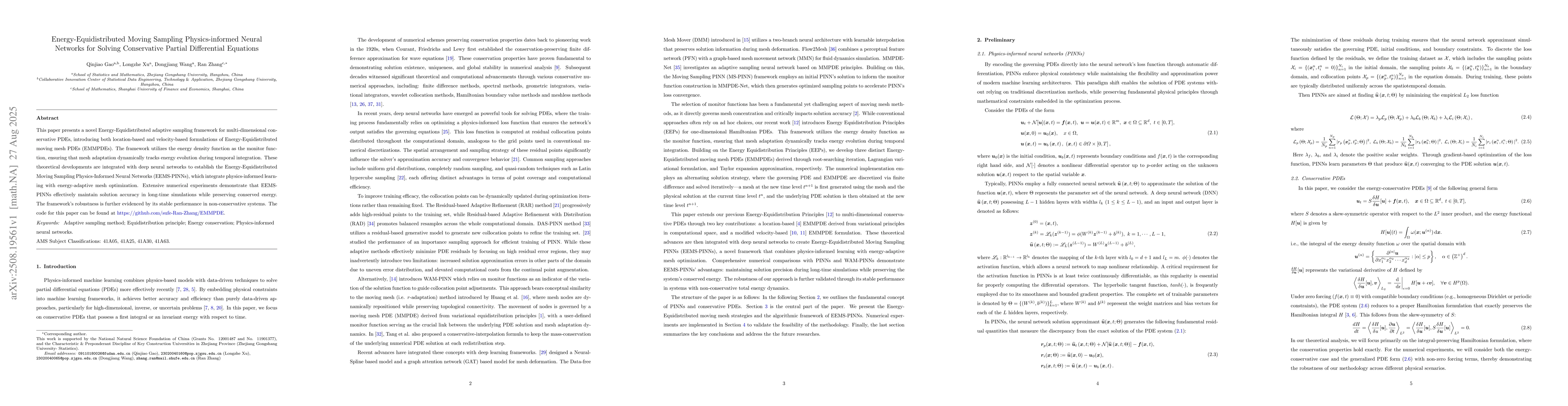 This paper presents a novel Energy-Equidistributed adaptive sampling framework for multi-dimensional conservative PDEs, introducing both location-based and velocity-based formulations of Energy-Equidistributed moving mesh PDEs (EMMPDEs). The framework utilizes the energy density function as the monitor function, ensuring that mesh adaptation dynamically tracks energy evolution during temporal integration. These theoretical developments are integrated with deep neural networks to establish the Energy-Equidistributed Moving Sampling Physics-Informed Neural Networks (EEMS-PINNs), which integrate physics-informed learning with energy-adaptive mesh optimization. Extensive numerical experiments demonstrate that EEMS-PINNs effectively maintain solution accuracy in long-time simulations while preserving conserved energy. The framework's robustness is further evidenced by its stable performance in non-conservative systems. The code for this paper can be found at https://github.com/sufe-Ran-Zhang/EMMPDE.