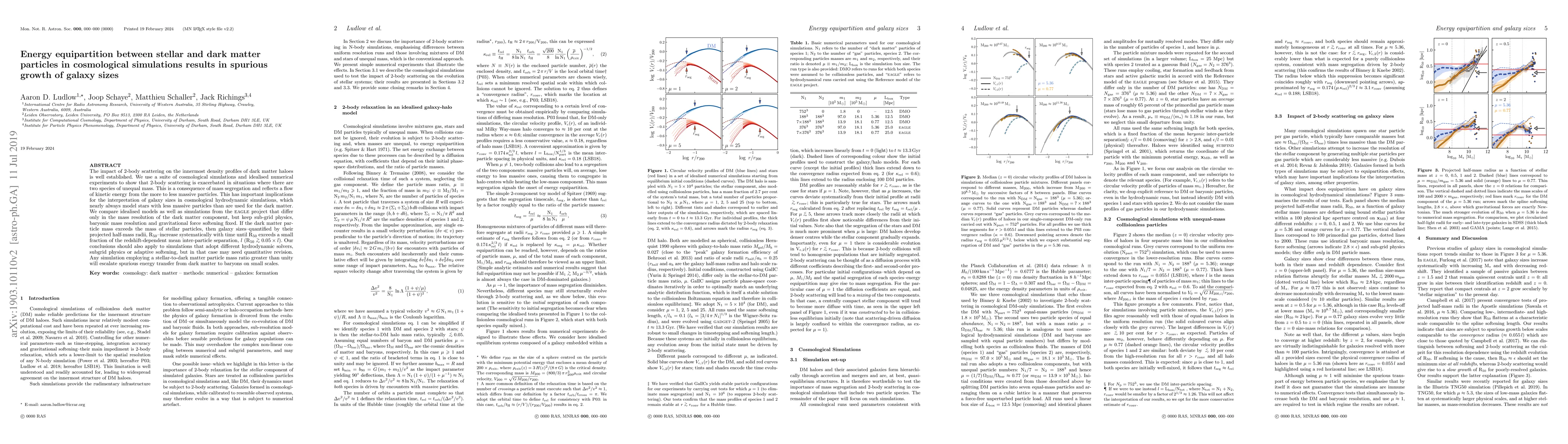 The impact of 2-body scattering on the innermost density profiles of dark matter haloes is well established. We use a suite of cosmological simulations and idealised numerical experiments to show that 2-body scattering is exacerbated in situations where there are two species of unequal mass. This is a consequence of mass segregation and reflects a flow of kinetic energy from the more to less massive particles. This has important implications for the interpretation of galaxy sizes in cosmological hydrodynamic simulations, which nearly always model stars with less massive particles than are used for the dark matter. We compare idealised models as well as simulations from the EAGLE project that differ only in the mass resolution of the dark matter component, but keep sub-grid physics, baryonic mass resolution and gravitational force softening fixed. If the dark matter particle mass exceeds the mass of stellar particles, then galaxy sizes--quantified by their projected half-mass radii, ${\rm R_{50}}$--increase systematically with time until ${\rm R_{50}}$ exceeds a small fraction of the redshift-dependent mean inter-particle separation, $l$ (${\rm R_{50}}\geq 0.05\times l$). Our conclusions should also apply to simulations that adopt different hydrodynamic solvers, subgrid physics or adaptive softening, but in that case may need quantitative revision. Any simulation employing a stellar-to-dark matter particle mass ratio greater than unity will escalate spurious energy transfer from dark matter to baryons on small scales.