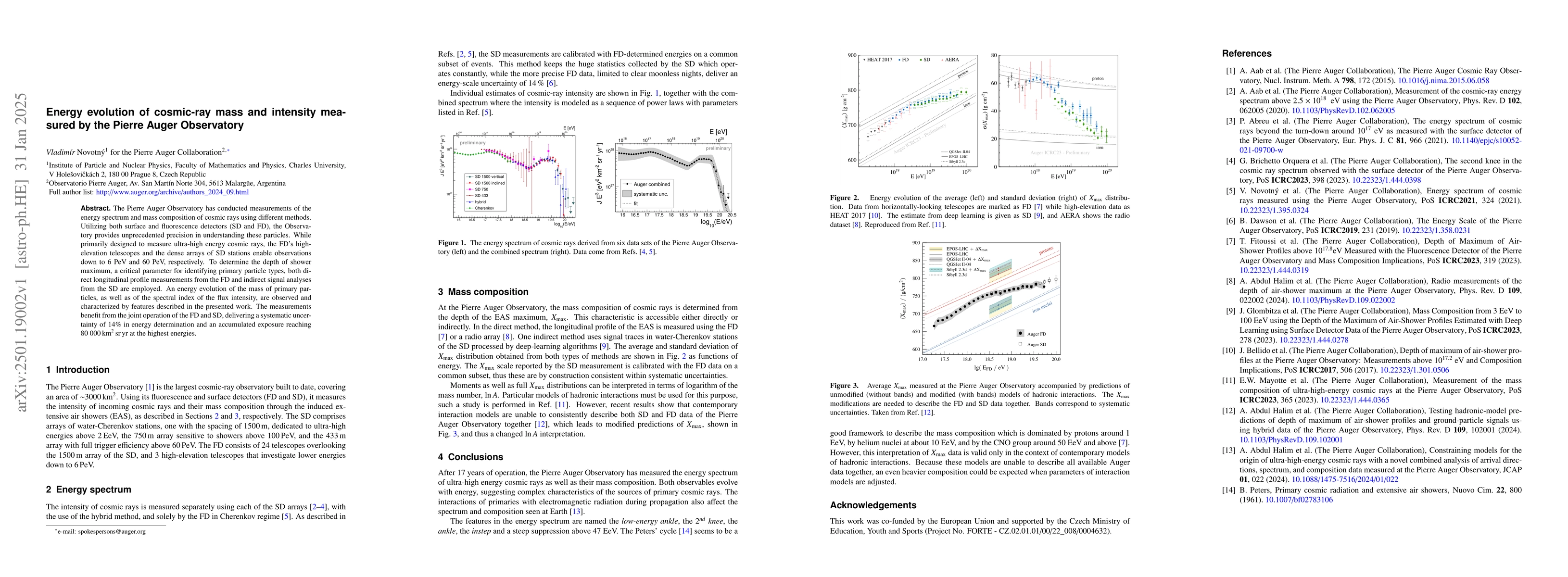 The Pierre Auger Observatory uses both surface detectors (SD) and fluorescence detectors (FD) to measure the energy spectrum and mass composition of cosmic rays. SD comprises arrays of water-Cherenkov stations, while FD consists of 24 telescopes overlooking the 1500m SD array and 3 high-elevation telescopes for lower energies. The depth of shower maximum (Xmax) is used to determine primary particle types, measured directly by FD or indirectly by SD using deep-learning algorithms.