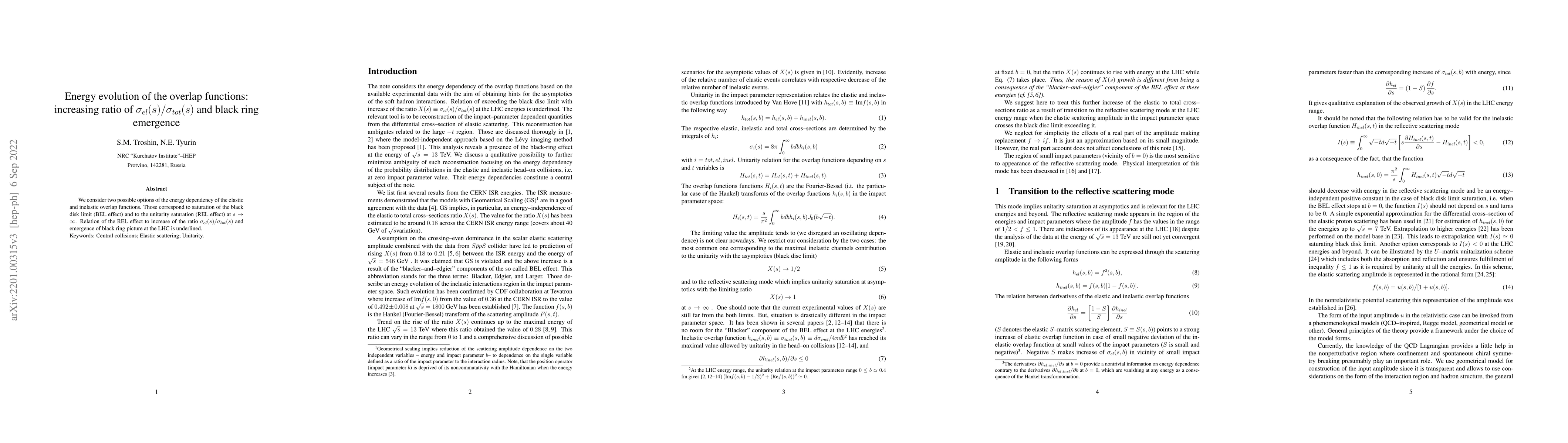 This paper investigates the energy dependence of elastic and inelastic overlap functions, highlighting the transition from the black disk limit to the unitarity saturation effect. It emphasizes the increasing ratio of $\sigma_{el}(s)/\sigma_{tot}(s)$ and the emergence of the black ring picture at the LHC.