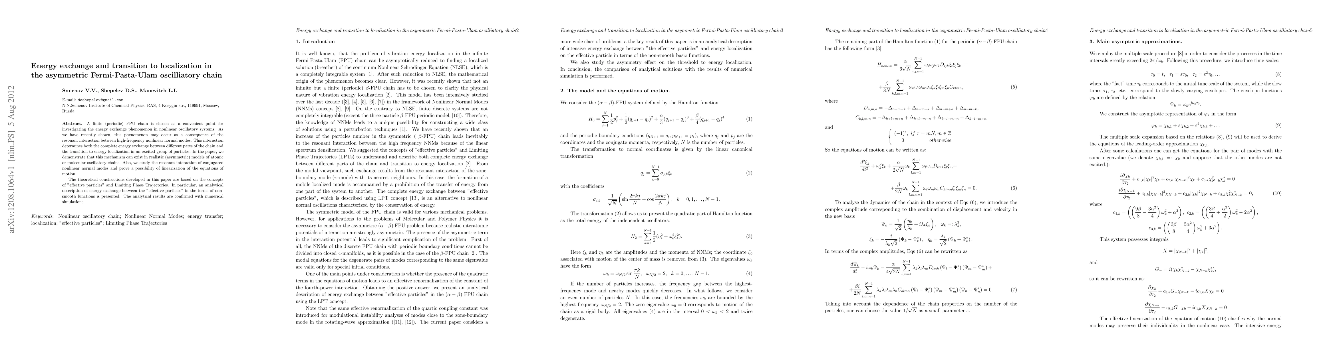 A finite (periodic) FPU chain is chosen as a convenient point for investigating the energy exchange phenomenon in nonlinear oscillatory systems. As we have recently shown, this phenomenon may occur as a consequence of the resonant interaction between high-frequency nonlinear normal modes. This interaction determines both the complete energy exchange between different parts of the chain and the transition to energy localization in an excited group of particles. In the paper, we demonstrate that this mechanism can exist in realistic (asymmetric) models of atomic or molecular oscillatory chains. Also, we study the resonant interaction of conjugated nonlinear normal modes and prove a possibility of linearization of the equations of motion. The theoretical constructions developed in this paper are based on the concepts of "effective particles" and Limiting Phase Trajectories. In particular, an analytical description of energy exchange between the "effective particles" in the terms of non-smooth functions is presented. The analytical results are confirmed with numerical simulations.