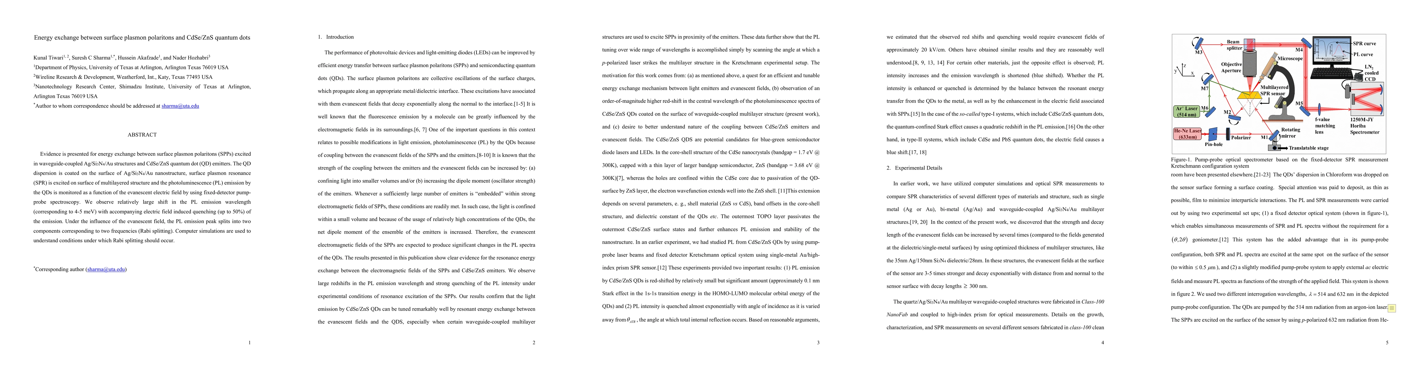 Evidence is presented for energy exchange between surface plasmon polaritons (SPPs) excited in waveguide-coupled Ag/Si3N4/Au structures and CdSe/ZnS quantum dot (QD) emitters. The QD dispersion is coated on the surface of Ag/Si3N4/Au nanostructure, surface plasmon resonance (SPR) is excited on surface of multilayered structure and the photoluminescence (PL) emission by the QDs is monitored as a function of the evanescent electric field by using fixed-detector pump-probe spectroscopy. We observe relatively large shift in the PL emission wavelength (corresponding to 4-5 meV) with accompanying electric field induced quenching (up to 50%) of the emission. Under the influence of the evanescent field, the PL emission peak splits into two components corresponding to two frequencies (Rabi splitting). Computer simulations are used to understand conditions under which Rabi splitting should occur.
