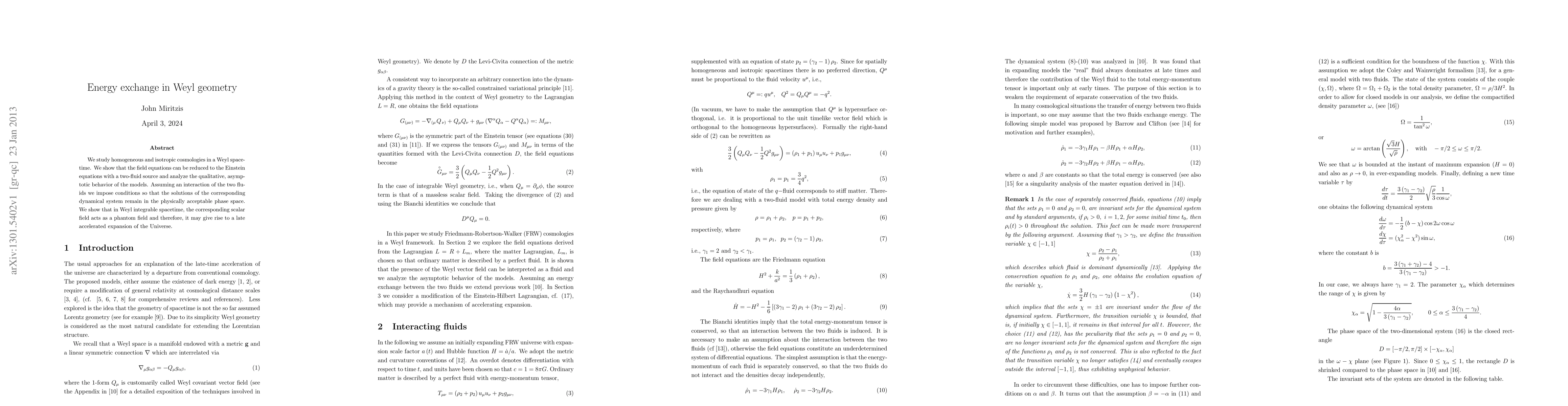 We study homogeneous and isotropic cosmologies in a Weyl spacetime. We show that the field equations can be reduced to the Einstein equations with a two-fluid source and analyze the qualitative, asymptotic behavior of the models. Assuming an interaction of the two fluids we impose conditions so that the solutions of the corresponding dynamical system remain in the physically acceptable phase space. We show that in Weyl integrable spacetime, the corresponding scalar field acts as a phantom field and therefore, it may give rise to a late accelerated expansion of the Universe.