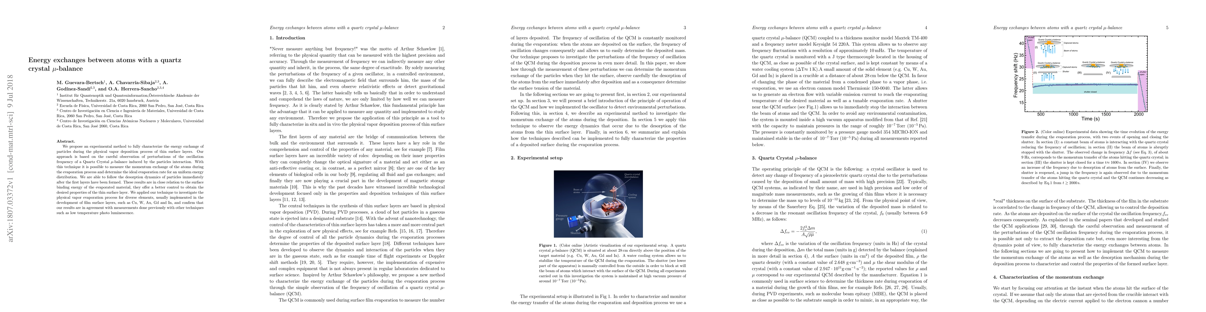We propose an experimental method to fully characterize the energy exchange of particles during the physical vapor deposition process of thin surface layers. Our approach is based on the careful observation of perturbations of the oscillation frequency of a Quartz Crystal $\mu$-balance induced by the particles interaction. With this technique, it is possible to measure the momentum exchange of the atoms during the evaporation process and determine the ideal evaporation rate for an uniform energy distribution. We are able to follow the desorption dynamics of particles immediately after the first layers have been formed. These results are in close relation to the surface binding energy of the evaporated material, they offer a better control to obtain the desired properties of the thin surface layer. We applied our technique to investigate the physical vapor evaporation process for diverse elements, usually implemented in the development of film surface layers, such as Cu, W, Au, Gd and In, and confirm that our results are in agreement with measurements done previously with other techniques such as low-temperature photoluminescence.