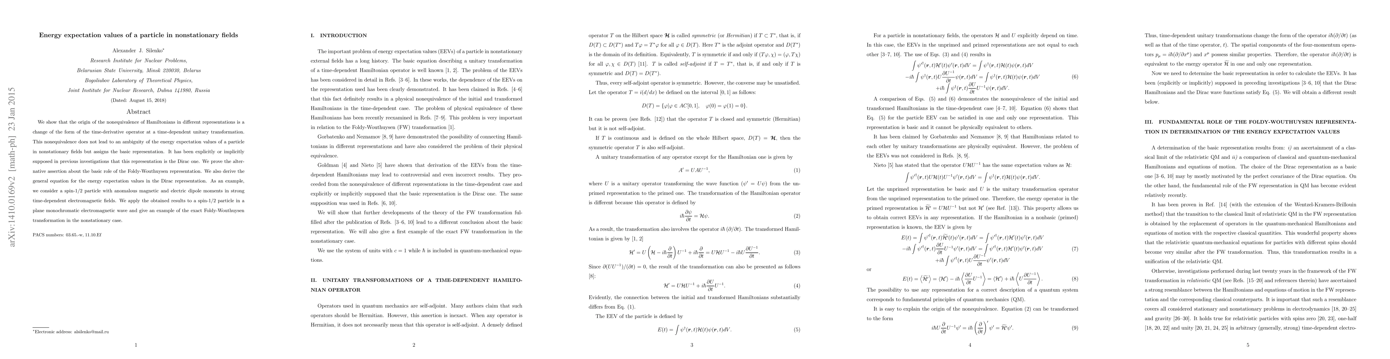 We show that the origin of the nonequivalence of Hamiltonians in different representations is a change of the form of the time-derivative operator at a time-dependent unitary transformation. This nonequivalence does not lead to an ambiguity of the energy expectation values of a particle in nonstationary fields but assigns the basic representation. It has been explicitly or implicitly supposed in previous investigations that this representation is the Dirac one. We prove the alternative assertion about the basic role of the Foldy-Wouthuysen representation. We also derive the general equation for the energy expectation values in the Dirac representation. As an example, we consider a spin-1/2 particle with anomalous magnetic and electric dipole moments in strong time-dependent electromagnetic fields. We apply the obtained results to a spin-1/2 particle in a plane monochromatic electromagnetic wave and give an example of the exact Foldy-Wouthuysen transformation in the nonstationary case.