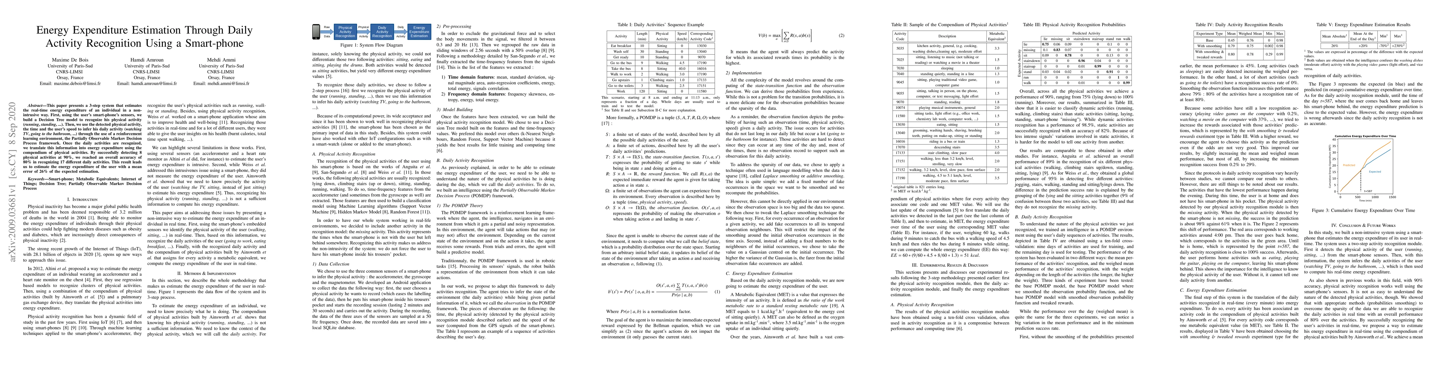 This paper proposes a three-step system for non-intrusive real-time energy expenditure estimation using a smartphone. It employs a Decision Tree model for physical activity recognition, a reinforcement learning framework for daily activity inference, and a compendium of physical activities to estimate energy expenditure, achieving an overall accuracy of 80% with an error margin of 26%.