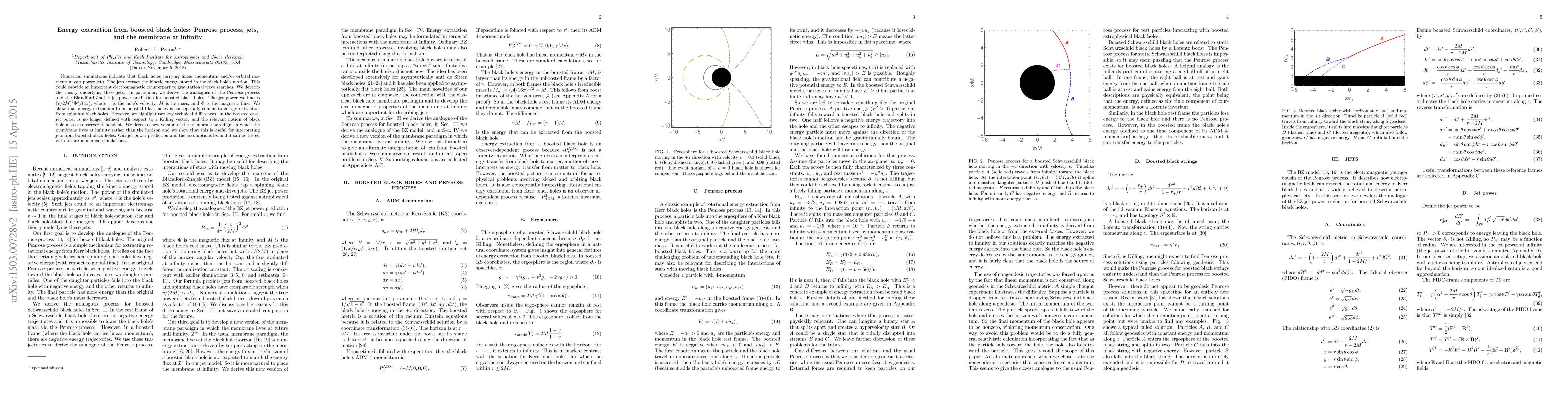 This paper develops the theoretical framework for energy extraction from black holes with linear momentum, focusing on the mechanisms powering jets through the Penrose process and the Blandford-Znajek mechanism. The derived jet power formula highlights the dependence on the black hole's velocity and magnetic flux, and introduces a new membrane paradigm at infinity for interpreting these jets.