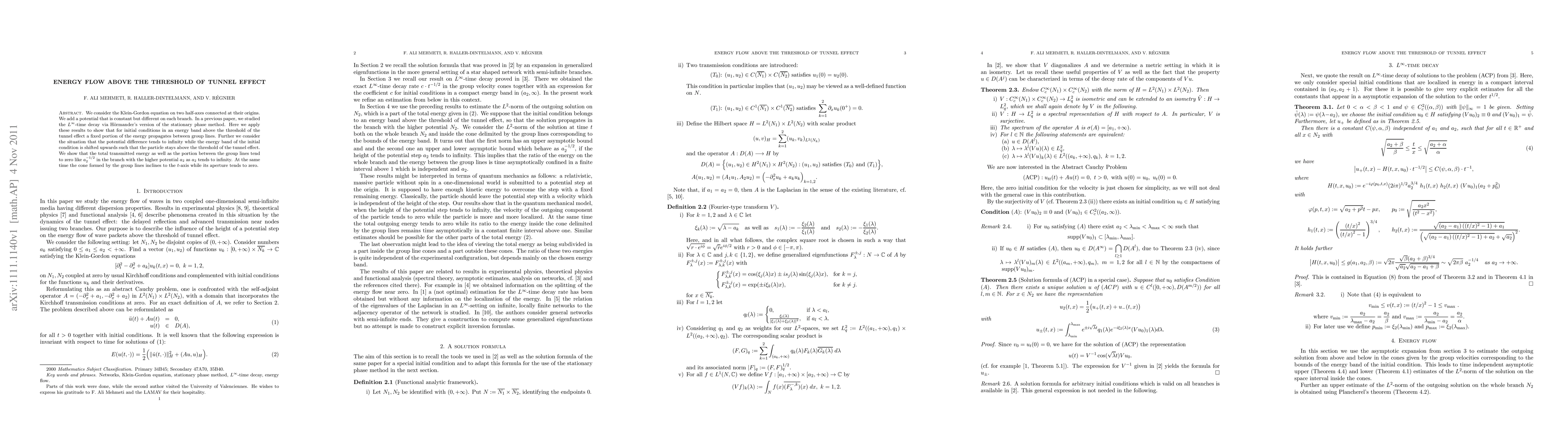 We consider the Klein-Gordon equation on two half-axes connected at their origins. We add a potential that is constant but different on each branch. In a previous paper, we studied the L-infinity-time decay via H\"ormander's version of the stationary phase method. Here we apply these results to show that for initial conditions in an energy band above the threshold of the tunnel effect a fixed portion of the energy propagates between group lines. Further we consider the situation that the potential difference tends to infinity while the energy band of the initial condition is shifted upwards such that the particle stays above the threshold of tunnel effect. We show that the total transmitted energy as well as the portion between the group lines tend to zero like the inverse of the square root of the higher potential in the corresponding branch if this potential tends to infinity. At the same time the cone formed by the group lines inclines to the t-axis while its aperture tends to zero.