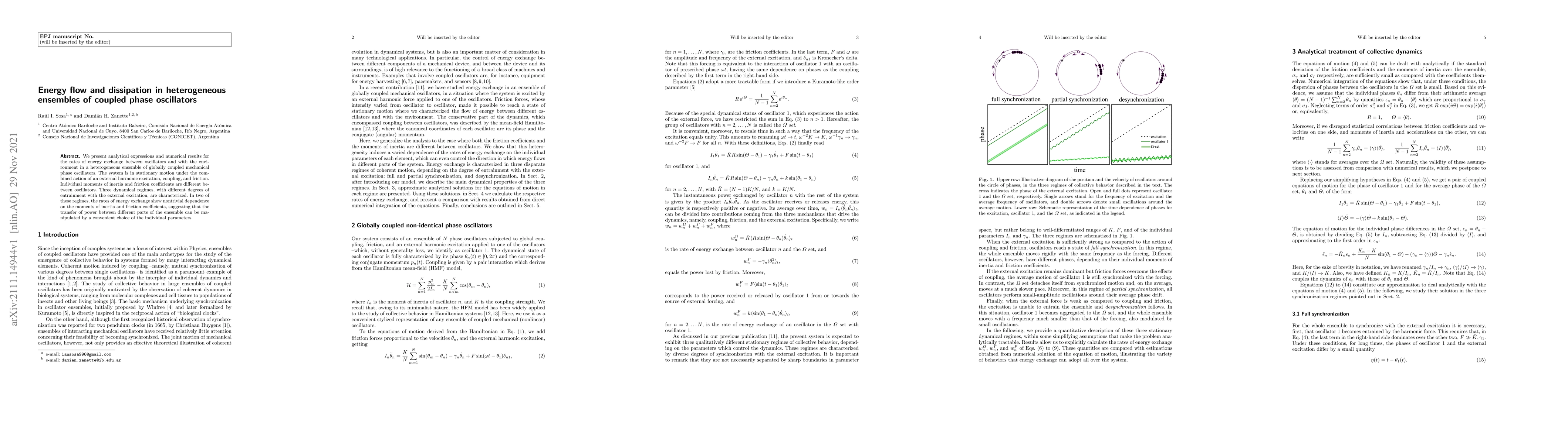 This paper investigates energy flow and dissipation in a heterogeneous ensemble of globally coupled mechanical phase oscillators, revealing three dynamical regimes with varying degrees of entrainment. The rates of energy exchange show complex dependencies on individual moments of inertia and friction coefficients, suggesting potential control over power transfer within the ensemble.
