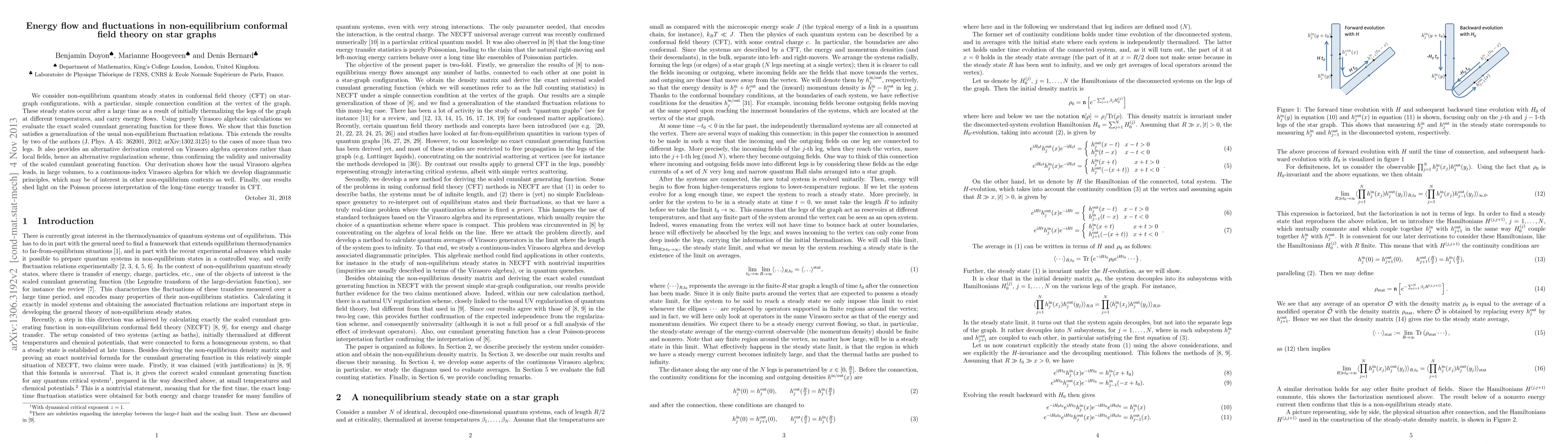 This paper evaluates the energy flow and fluctuations in non-equilibrium conformal field theory on star graphs, deriving the long-time cumulant generating function using Virasoro algebra. It generalizes previous results to configurations with more than two legs and provides a new regularization scheme based on Virasoro algebra operators.