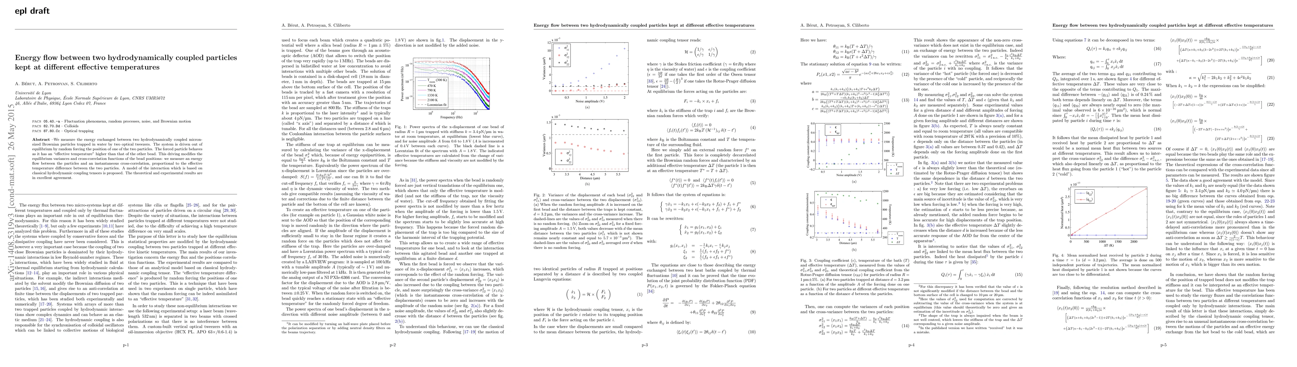 This study measures energy exchange between two hydrodynamically coupled micron-sized particles in water, driven out of equilibrium by random forcing of one particle, which exhibits higher "effective temperature." The research reveals an energy flow and instantaneous cross-correlation proportional to the temperature difference, validated by a classical hydrodynamic model.