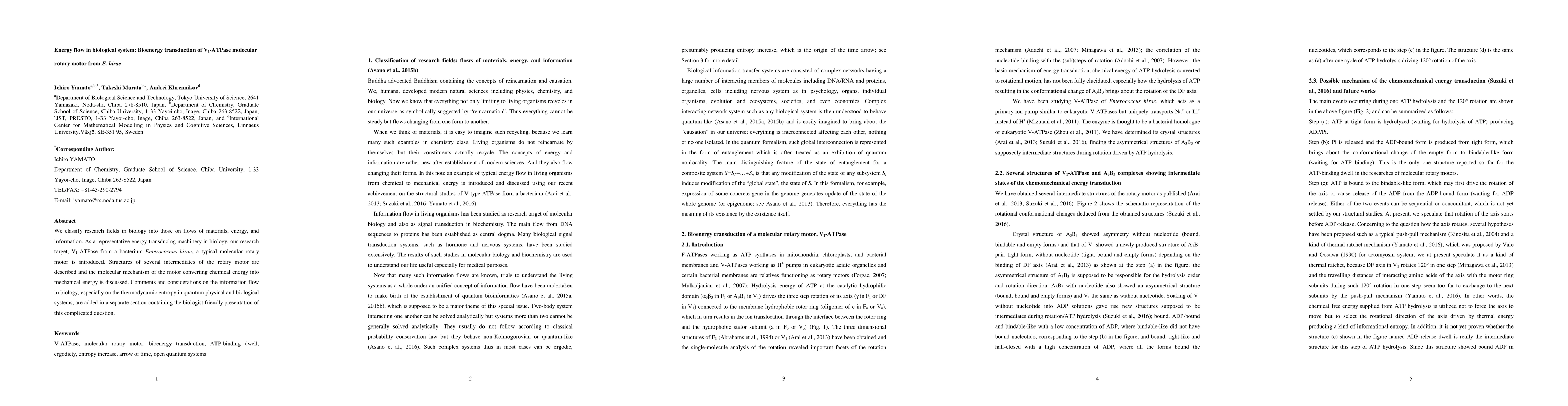 We classify research fields in biology into those on flows of materials, energy, and information. As a representative energy transducing machinery in biology, our research target, V1-ATPase from a bacterium Enterococcus hirae, a typical molecular rotary motor is introduced. Structures of several intermediates of the rotary motor are described and the molecular mechanism of the motor converting chemical energy into mechanical energy is discussed. Comments and considerations on the information flow in biology, especially on the thermodynamic entropy in quantum physical and biological systems, are added in a separate section containing the biologist friendly presentation of this complicated question.