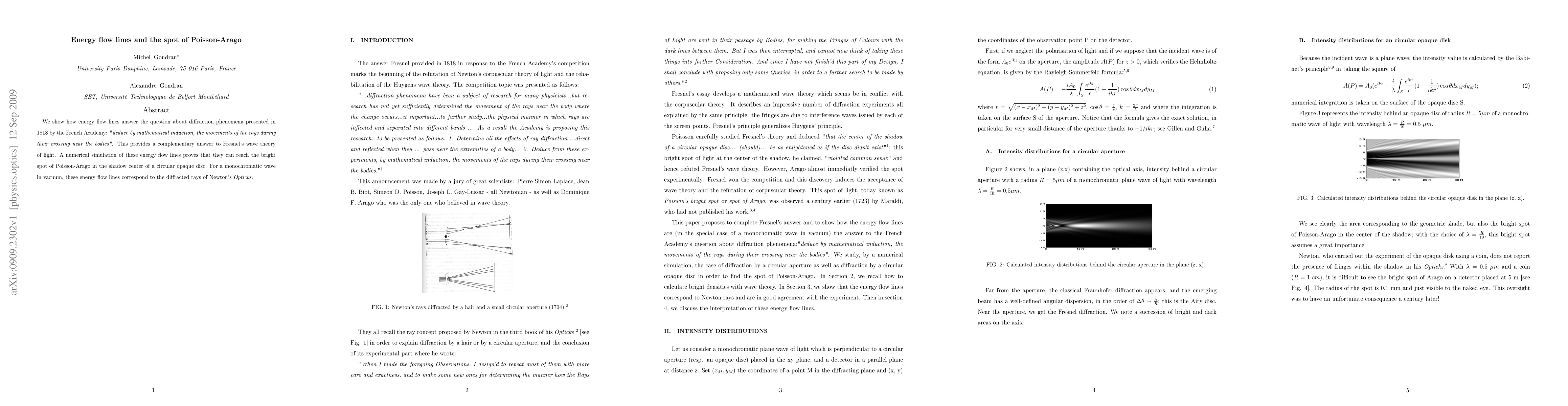Research uses energy flow lines to calculate diffraction patterns near opaque bodies, answering a 1818 question from the French Academy about light behavior, with results matching Newton's Opticks for monochromatic waves in vacuum.