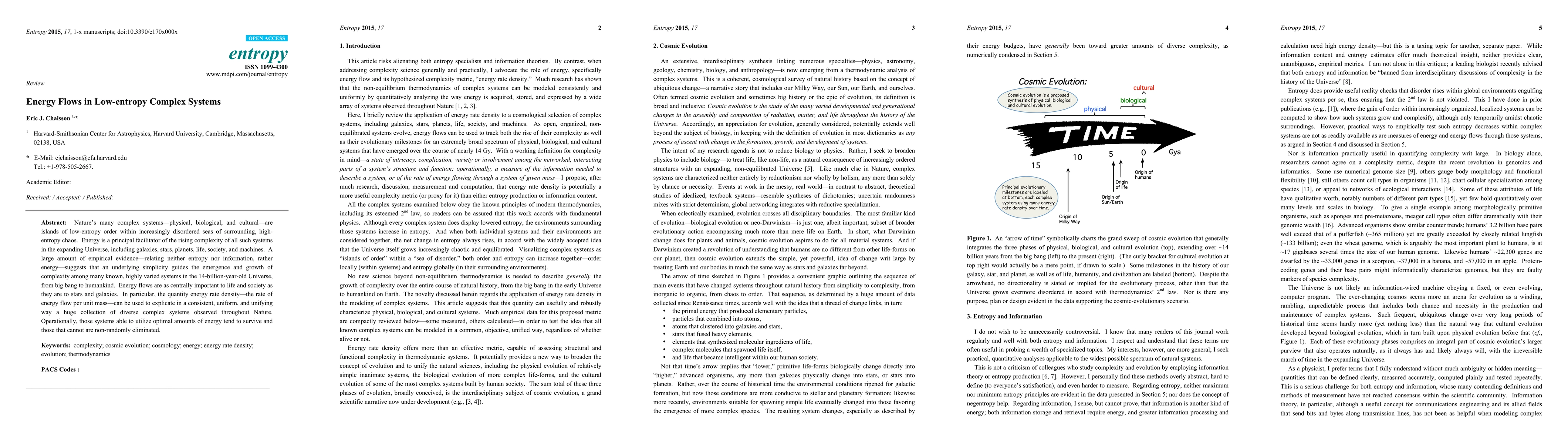 Nature's many complex systems--physical, biological, and cultural--are islands of low-entropy order within increasingly disordered seas of surrounding, high-entropy chaos. Energy is a principal facilitator of the rising complexity of all such systems in the expanding Universe, including galaxies, stars, planets, life, society, and machines. A large amount of empirical evidence--relating neither entropy nor information, rather energy--suggests that an underlying simplicity guides the emergence and growth of complexity among many known, highly varied systems in the 14-billion-year-old Universe, from big bang to humankind. Energy flows are as centrally important to life and society as they are to stars and galaxies. In particular, the quantity energy rate density--the rate of energy flow per unit mass--can be used to explicate in a consistent, uniform, and unifying way a huge collection of diverse complex systems observed throughout Nature. Operationally, those systems able to utilize optimal amounts of energy tend to survive and those that cannot are non-randomly eliminated.