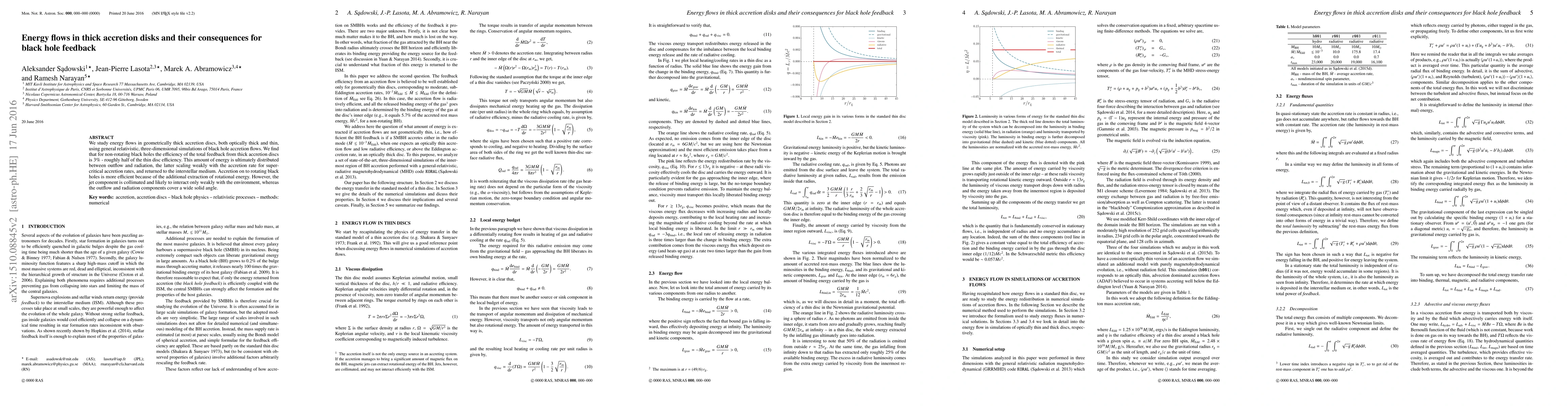 This research investigates energy flows in thick accretion disks around black holes using relativistic simulations, finding that non-rotating black holes exhibit a feedback efficiency of 3%, half of that in thin discs, with energy distributed between outflow and radiation. Rotating black holes are more efficient due to rotational energy extraction, though jets are collimated and less impactful compared to broader outflow and radiation.