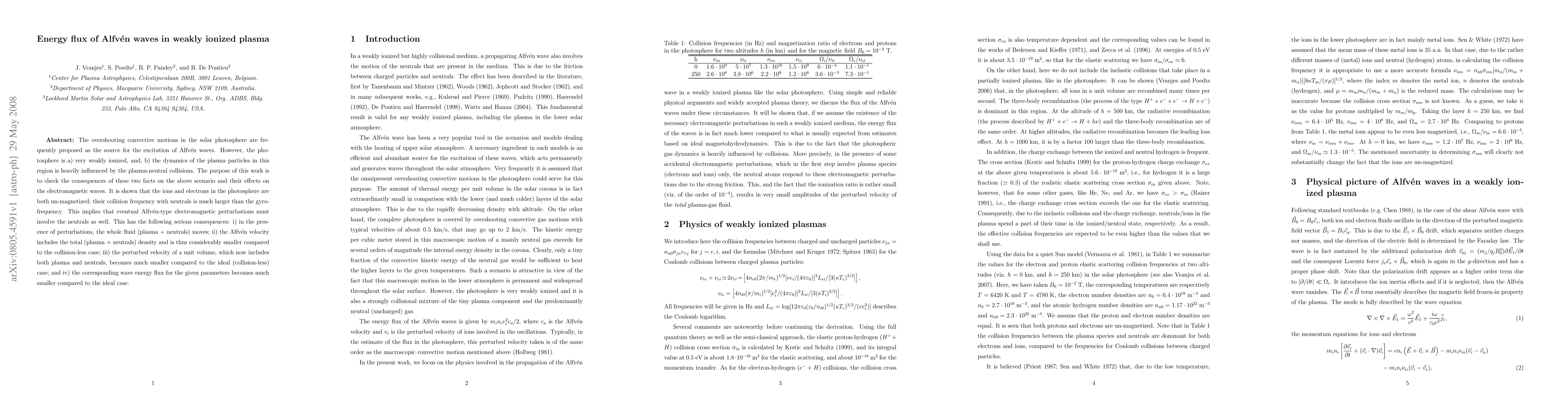 A study shows that Alfvén waves in a weakly ionized plasma have significantly reduced energy flux due to interactions with neutral particles, leading to smaller wave velocities and energies compared to ideal collision-less cases.
