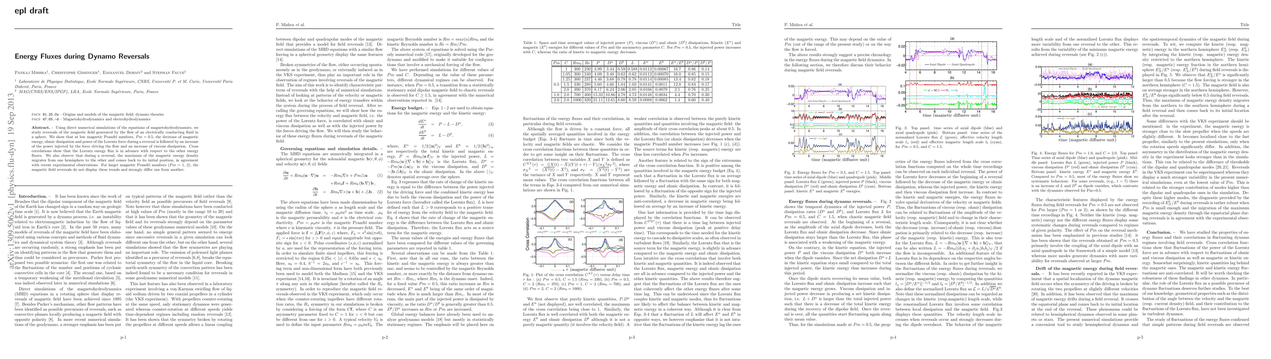 Using direct numerical simulations of the equations of magnetohydrodynamics, we study reversals of the magnetic field generated by the flow of an electrically conducting fluid in a sphere. We show that at low magnetic Prandtl numbers, Pm=0.5, the decrease of magnetic energy, ohmic dissipation and power of the Lorentz force during a reversal is followed by an increase of the power injected by the force driving the flow and an increase of viscous dissipation. Cross correlations show that the Lorentz energy flux is in advance with respect to the other energy fluxes. We also observe that during a reversal, the maximum of the magnetic energy density migrates from one hemisphere to the other and comes back to its initial position, in agreement with recent experimental observations. For larger magnetic Prandtl numbers (Pm= 1, 2), the magnetic field reversals do not display these trends and strongly differ one from another.
