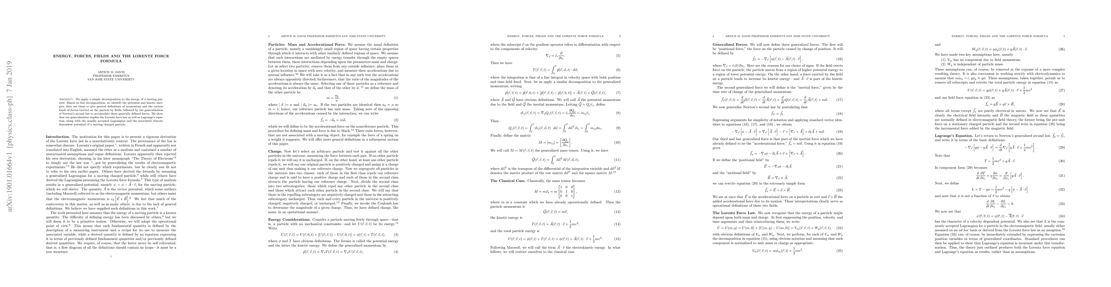 We apply a simple decomposition to the energy of a moving particle. Based on this decomposition, we identify the potential and kinetic energies, then use them to give general definitions of momentum and the various kinds of forces exerted on the particle by fields, followed by the generalization of Newton's second law to accomodate these generally defined forces. We show that our generalization implies the Lorentz force law as well as Lagrange's equation, along with the usually accepted Lagrangian and the associated velocity dependent potential of a moving charged particle.