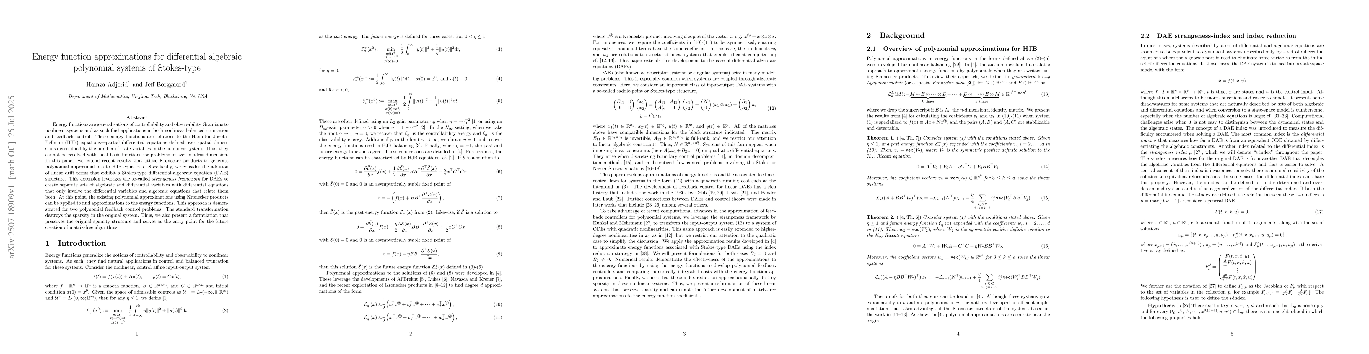 Energy functions are generalizations of controllability and observability Gramians to nonlinear systems and as such find applications in both nonlinear balanced truncation and feedback control. These energy functions are solutions to the Hamilton-Jacobi-Bellman (HJB) equations partial differential equations defined over spatial dimensions determined by the number of state variables in the nonlinear system. Thus, they cannot be resolved with local basis functions for problems of even modest dimension. In this paper, we extend recent results that utilize Kronecker products to generate polynomial approximations to HJB equations. Specifically, we consider the addition of linear drift terms that exhibit a Stokes-type differential-algebraic equation (DAE) structure. This extension leverages the so-called strangeness framework for DAEs to create separate sets of algebraic and differential variables with differential equations that only involve the differential variables and algebraic equations that relate them both. At this point, the existing polynomial approximations using Kronecker products can be applied to find approximations to the energy functions. This approach is demonstrated for two polynomial feedback control problems. The standard transformation destroys the sparsity in the original system. Thus, we also present a formulation that preserves the original sparsity structure and serves as the entry point for the future creation of matrix-free algorithms.